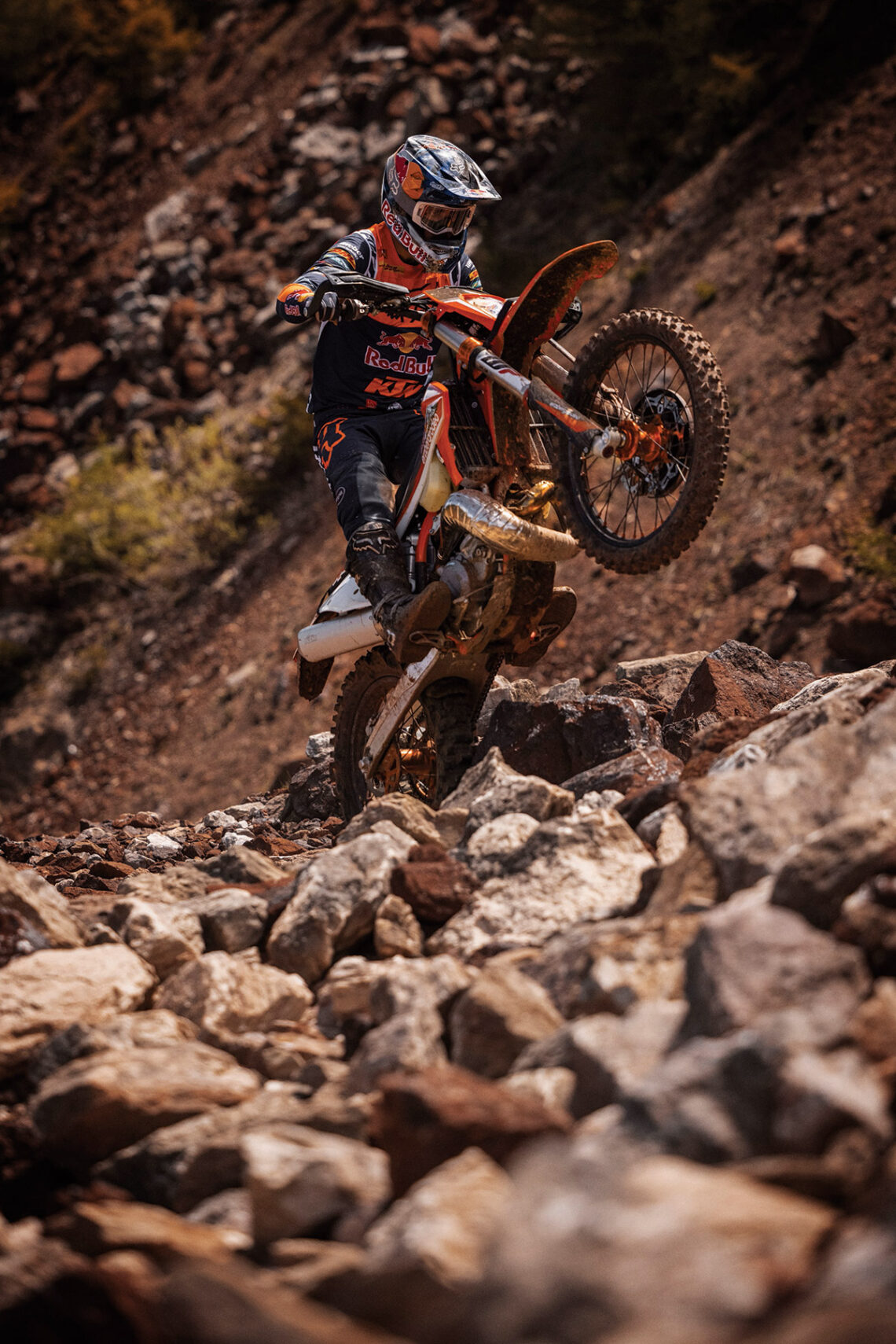 Lo consigue gracias a una serie de piezas de protecciones especiales, como cubremanos cerrados, protección de la bomba de embrague, una robusta placa de protección del motor y protectores de los discos de freno y del radiador, todo preparado para saltar entre las rocas.