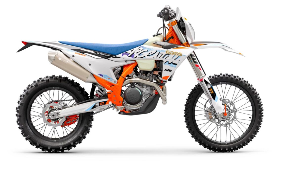 La KTM 500 EXC-F Six Days es el modelo más caro del catálogo de enduro puro de la marca debido a que es el más potente y con una serie de accesorios que ya trae de serie. Se basa en la versión estándar, pero además de lucir los colores de Argentina, donde se celebran este años los ISDE, monta una serie de componentes especiales: