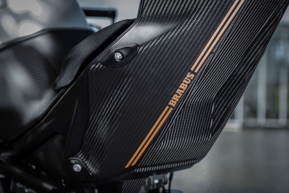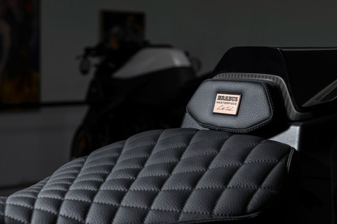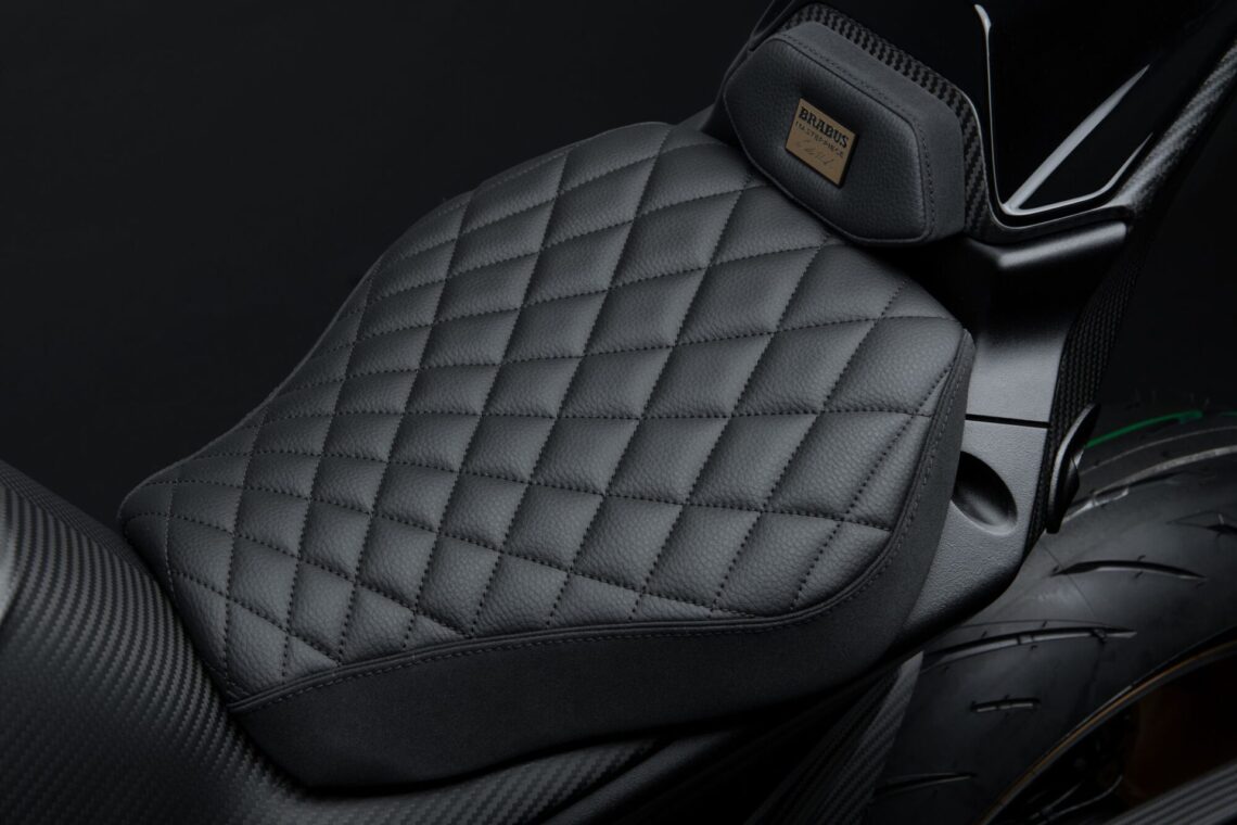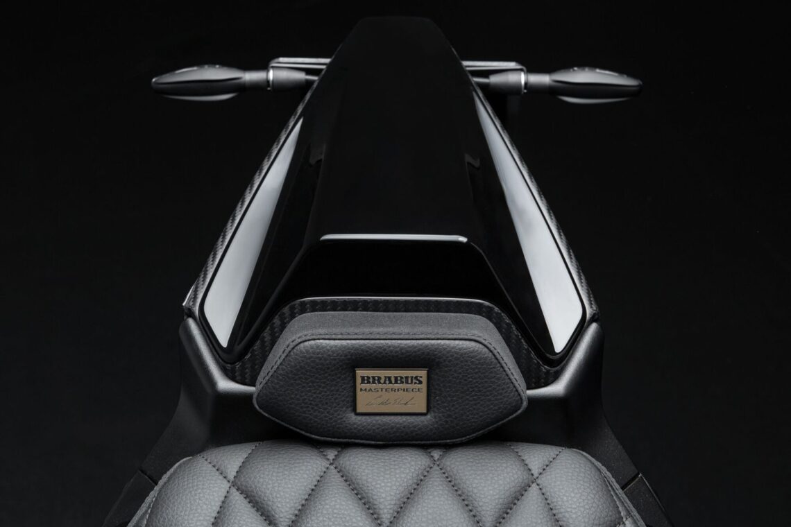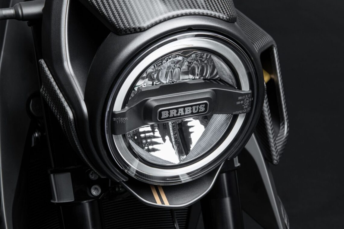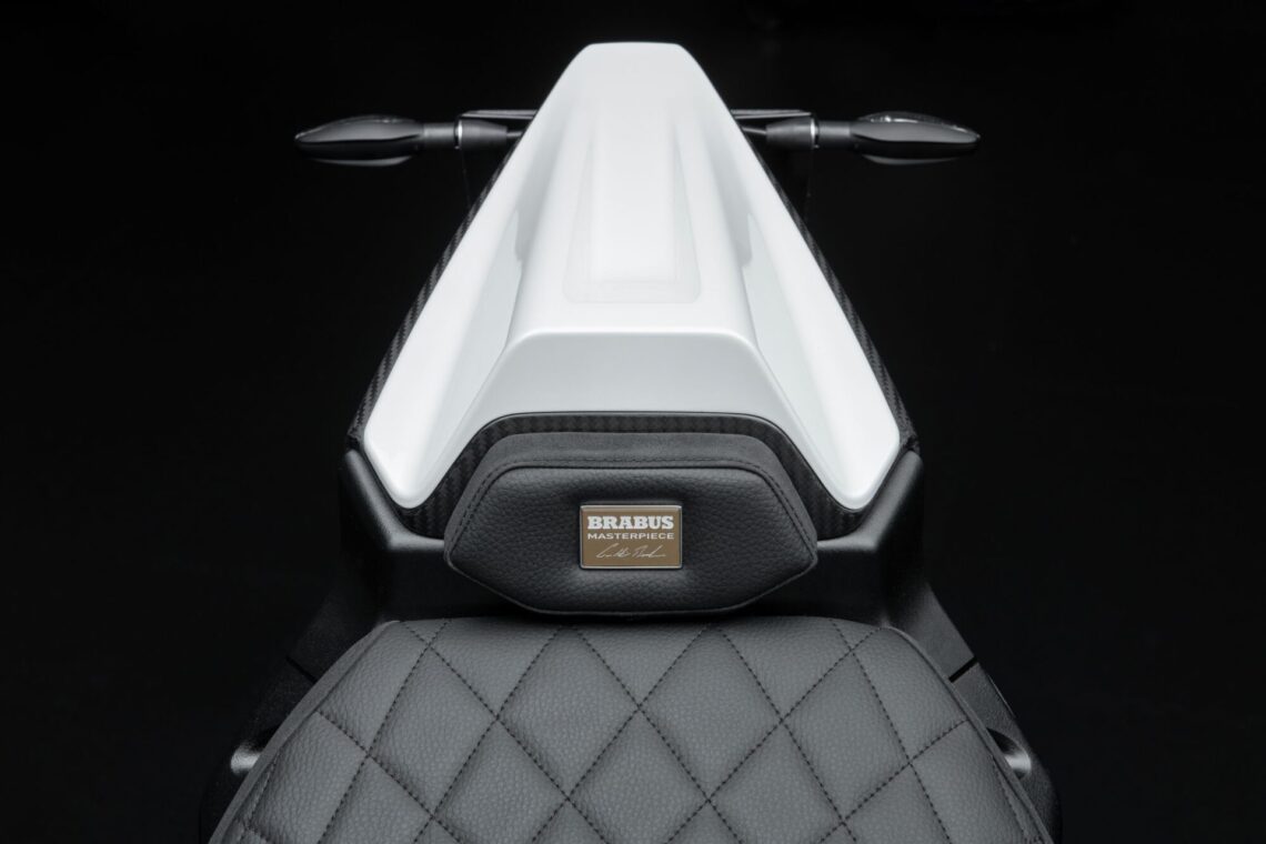 Sin embargo, las diferencias las vemos por fuera, gracias a la intervención del departamento Brabus Signature, con un frontal con faro LED circular que ya es inconfundible, aportando un aire cafe-racer muy bestia e inconfundible. El faro se enmarca con una visera Brabus de carbono visto mientras que este mismo material se aplica en otros elementos como los carenados laterales con alerones integrados al estilo de MotoGP, varias placas protectoras del motor, quilla y piezas del guardabarros delantero. Además, hay otros componentes que tienen un papel importante, como las impresionantes llantas forjadas de alta tecnología BRABUS Monoblock Z 'Gold Platinum' con secciones pulidas con diamante de 17" con 9 brazos específicas para este modelo, incluso los detalles en color dorado 'Frozen Gold' de los anillos decorativos alrededor de los dos silenciadores del sistema de escape deportivo BRABUS slip-on, los alerones, las franjas en la parte delantera y trasera, las placas "1 OF 25" Sign of Excellence en el depósito y BRABUS MASTERPIECE en la almohadilla del asiento, toques que distinguen a esta edición limitada. Las partes que cambian el color (negro o blanco) son el depósito, el colín y algunas partes del guardabarros delantero.