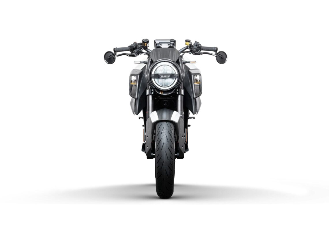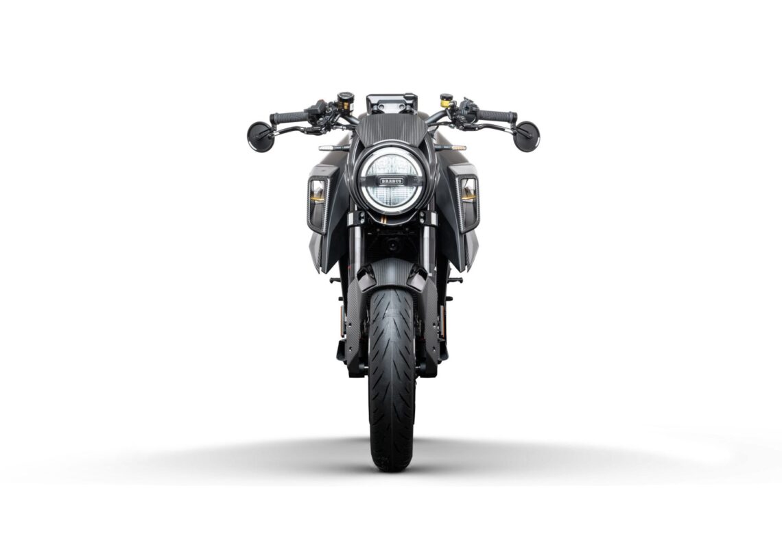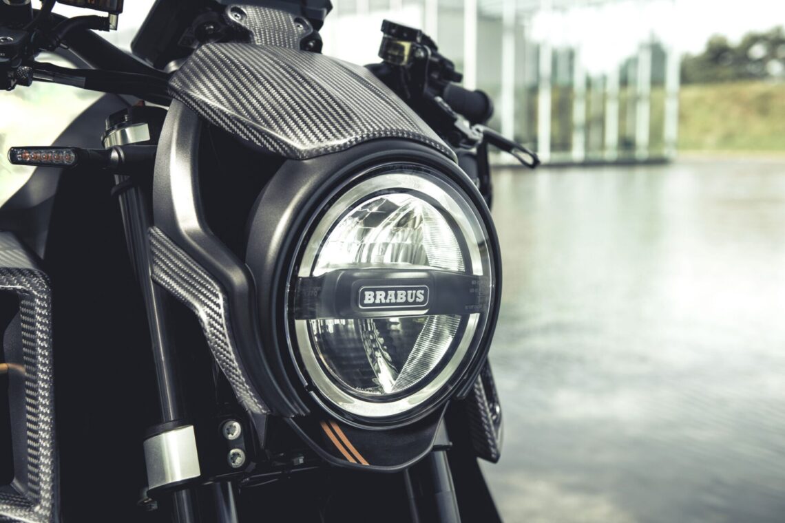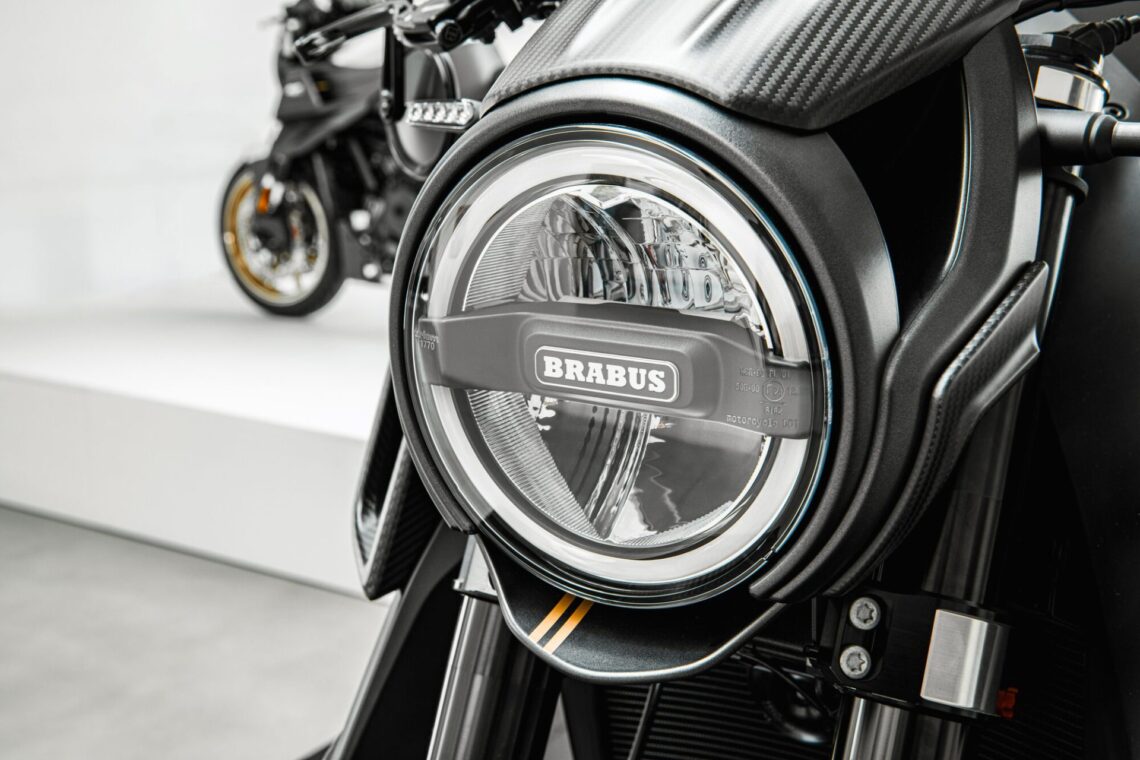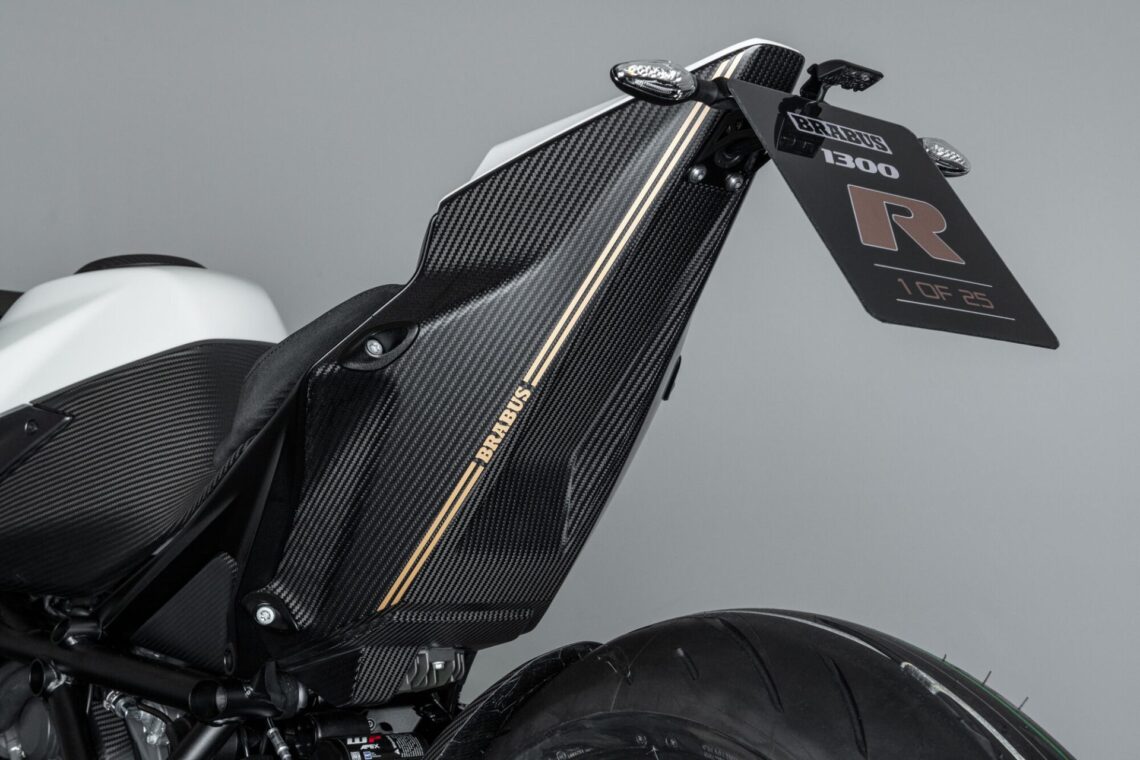 Sin embargo, las diferencias las vemos por fuera, gracias a la intervención del departamento Brabus Signature, con un frontal con faro LED circular que ya es inconfundible, aportando un aire cafe-racer muy bestia e inconfundible. El faro se enmarca con una visera Brabus de carbono visto mientras que este mismo material se aplica en otros elementos como los carenados laterales con alerones integrados al estilo de MotoGP, varias placas protectoras del motor, quilla y piezas del guardabarros delantero. Además, hay otros componentes que tienen un papel importante, como las impresionantes llantas forjadas de alta tecnología BRABUS Monoblock Z 'Gold Platinum' con secciones pulidas con diamante de 17" con 9 brazos específicas para este modelo, incluso los detalles en color dorado 'Frozen Gold' de los anillos decorativos alrededor de los dos silenciadores del sistema de escape deportivo BRABUS slip-on, los alerones, las franjas en la parte delantera y trasera, las placas "1 OF 25" Sign of Excellence en el depósito y BRABUS MASTERPIECE en la almohadilla del asiento, toques que distinguen a esta edición limitada. Las partes que cambian el color (negro o blanco) son el depósito, el colín y algunas partes del guardabarros delantero.
