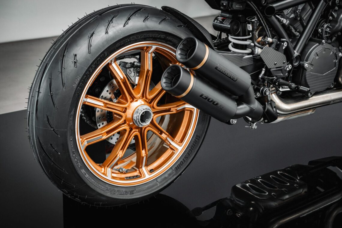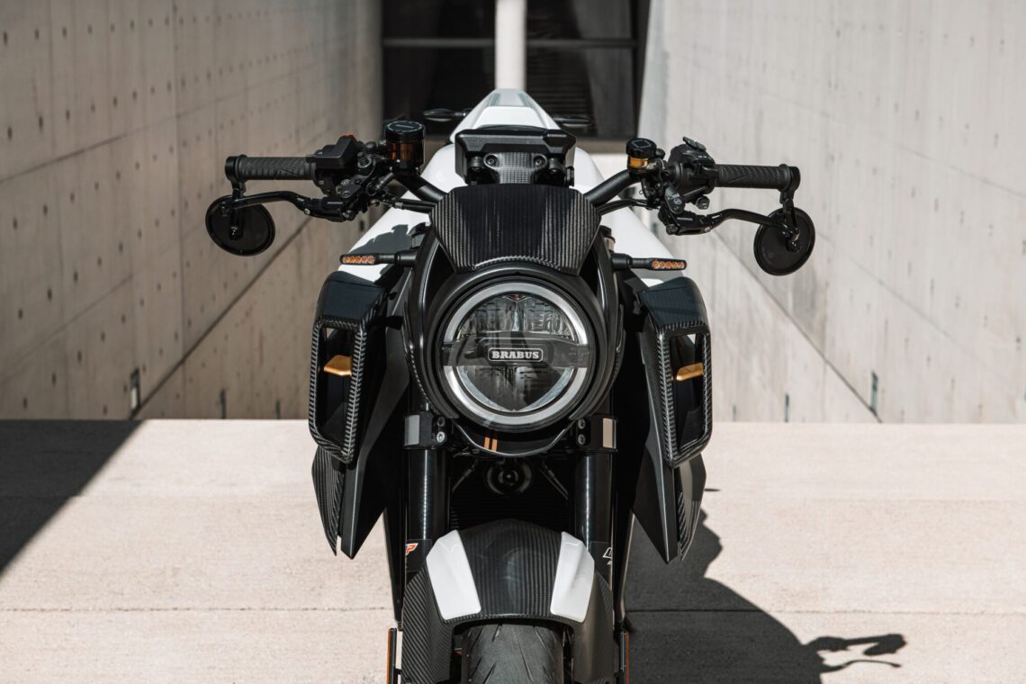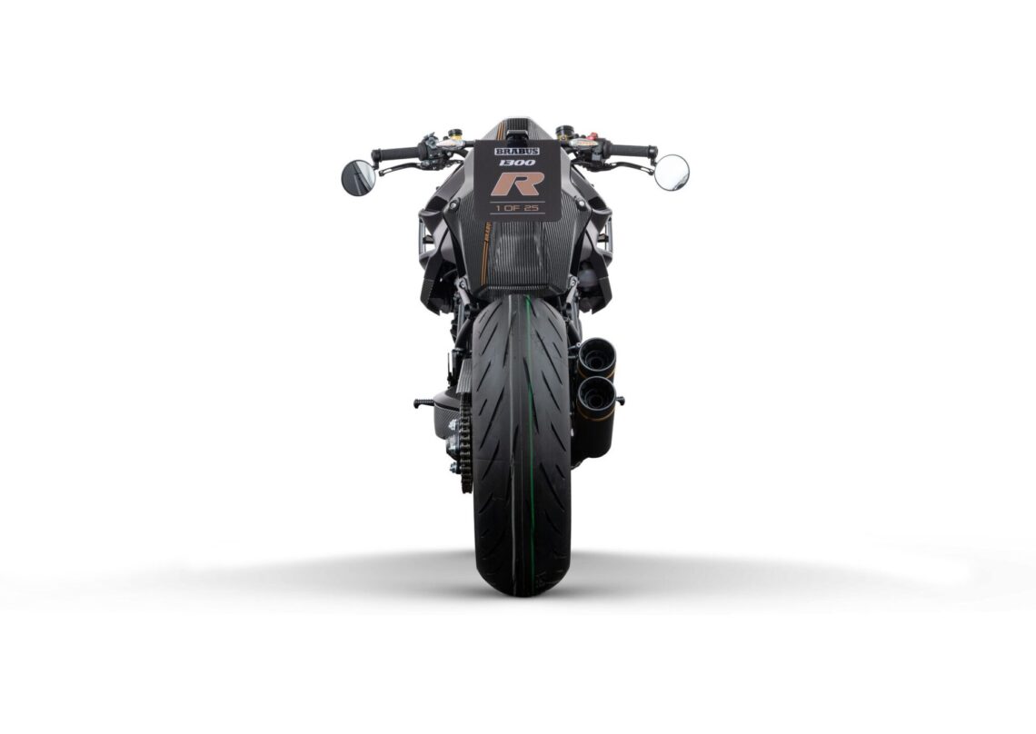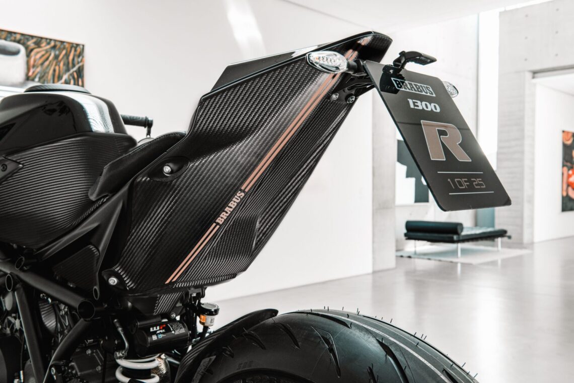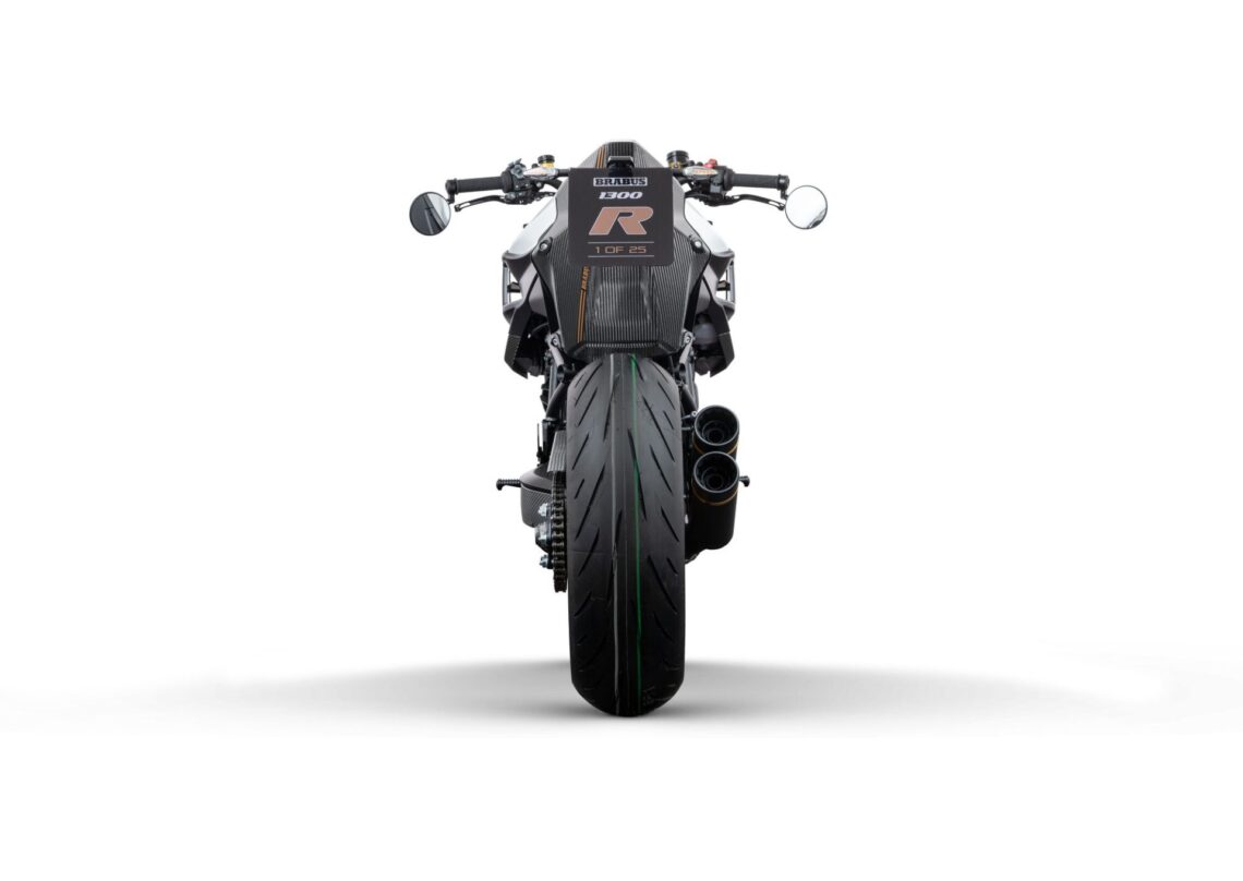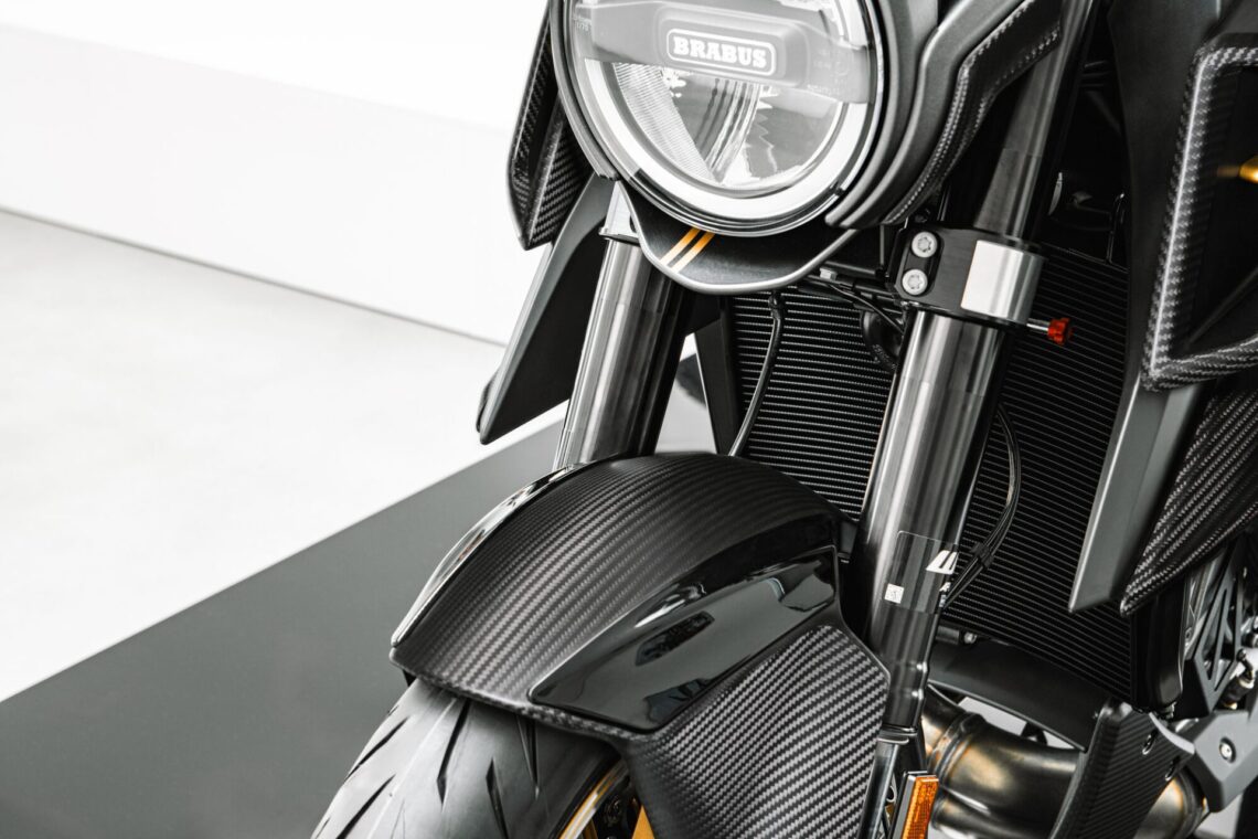 Sin embargo, las diferencias las vemos por fuera, gracias a la intervención del departamento Brabus Signature, con un frontal con faro LED circular que ya es inconfundible, aportando un aire cafe-racer muy bestia e inconfundible. El faro se enmarca con una visera Brabus de carbono visto mientras que este mismo material se aplica en otros elementos como los carenados laterales con alerones integrados al estilo de MotoGP, varias placas protectoras del motor, quilla y piezas del guardabarros delantero. Además, hay otros componentes que tienen un papel importante, como las impresionantes llantas forjadas de alta tecnología BRABUS Monoblock Z 'Gold Platinum' con secciones pulidas con diamante de 17" con 9 brazos específicas para este modelo, incluso los detalles en color dorado 'Frozen Gold' de los anillos decorativos alrededor de los dos silenciadores del sistema de escape deportivo BRABUS slip-on, los alerones, las franjas en la parte delantera y trasera, las placas "1 OF 25" Sign of Excellence en el depósito y BRABUS MASTERPIECE en la almohadilla del asiento, toques que distinguen a esta edición limitada. Las partes que cambian el color (negro o blanco) son el depósito, el colín y algunas partes del guardabarros delantero.