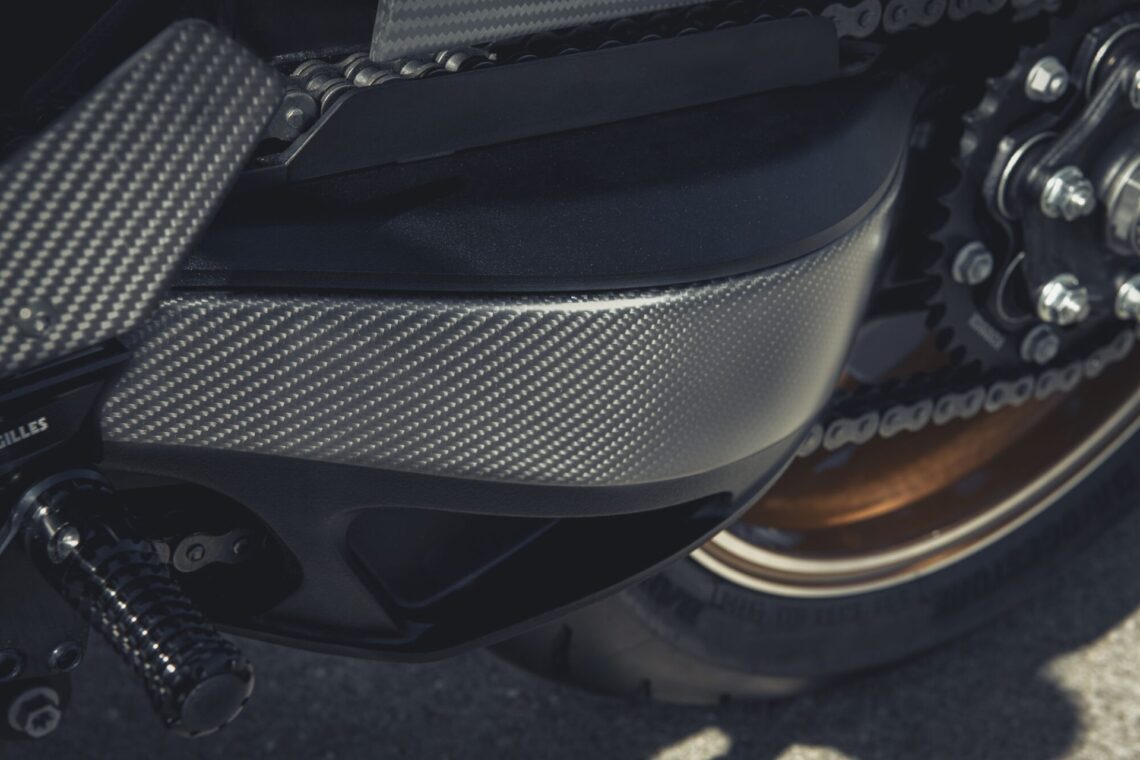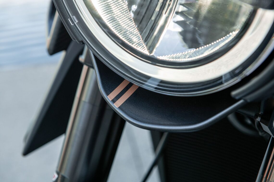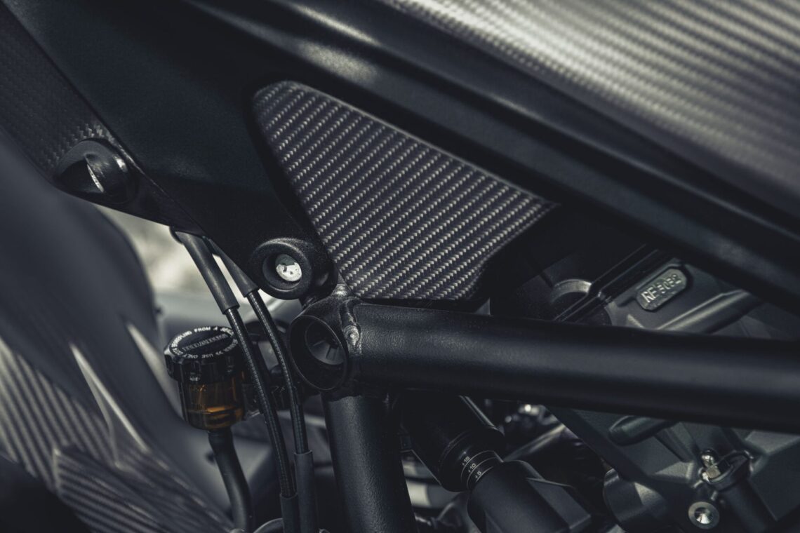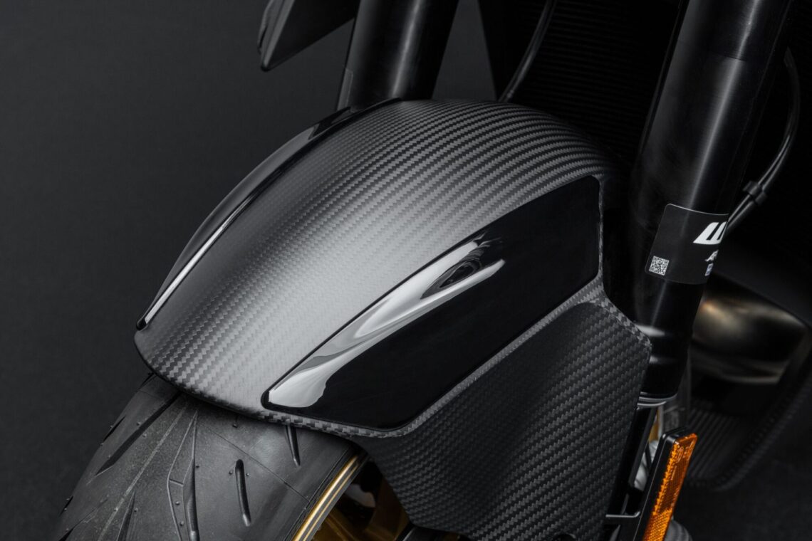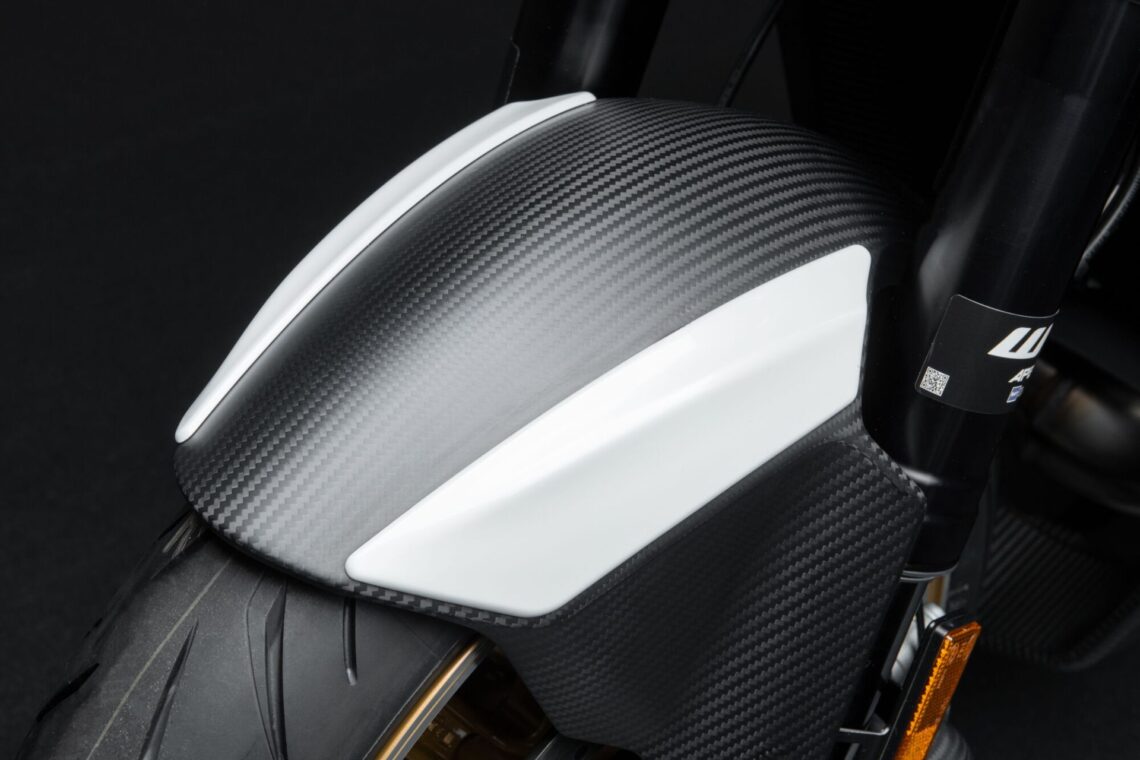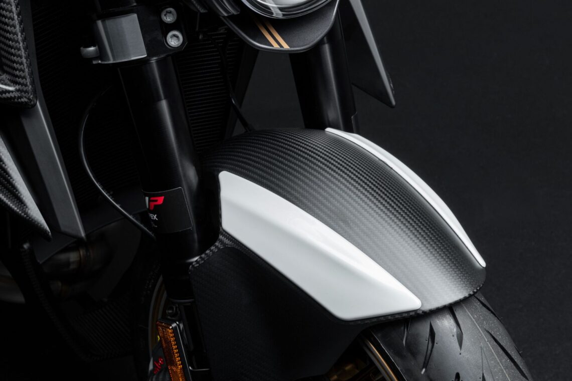 Sin embargo, las diferencias las vemos por fuera, gracias a la intervención del departamento Brabus Signature, con un frontal con faro LED circular que ya es inconfundible, aportando un aire cafe-racer muy bestia e inconfundible. El faro se enmarca con una visera Brabus de carbono visto mientras que este mismo material se aplica en otros elementos como los carenados laterales con alerones integrados al estilo de MotoGP, varias placas protectoras del motor, quilla y piezas del guardabarros delantero. Además, hay otros componentes que tienen un papel importante, como las impresionantes llantas forjadas de alta tecnología BRABUS Monoblock Z 'Gold Platinum' con secciones pulidas con diamante de 17" con 9 brazos específicas para este modelo, incluso los detalles en color dorado 'Frozen Gold' de los anillos decorativos alrededor de los dos silenciadores del sistema de escape deportivo BRABUS slip-on, los alerones, las franjas en la parte delantera y trasera, las placas "1 OF 25" Sign of Excellence en el depósito y BRABUS MASTERPIECE en la almohadilla del asiento, toques que distinguen a esta edición limitada. Las partes que cambian el color (negro o blanco) son el depósito, el colín y algunas partes del guardabarros delantero.