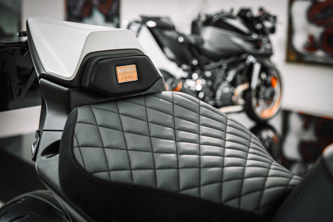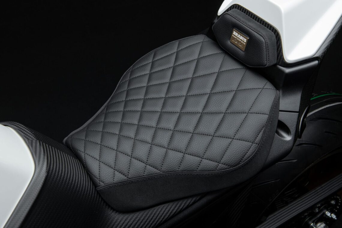 Un detalle premium lo vemos también a la hora de arrancar la moto, apareciendo en la pantalla TFT una animación específica de esta edición limitada. Por supuesto, el departamento de tapicería de Brabus ha cubierto el asiento individual personalizado con fino cuero negro con un patrón acolchado denominado "Diamond Rising" extremadamente preciso en ambas variantes de color.