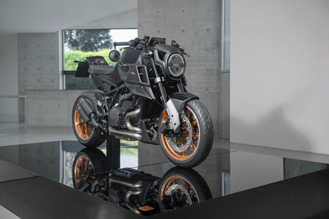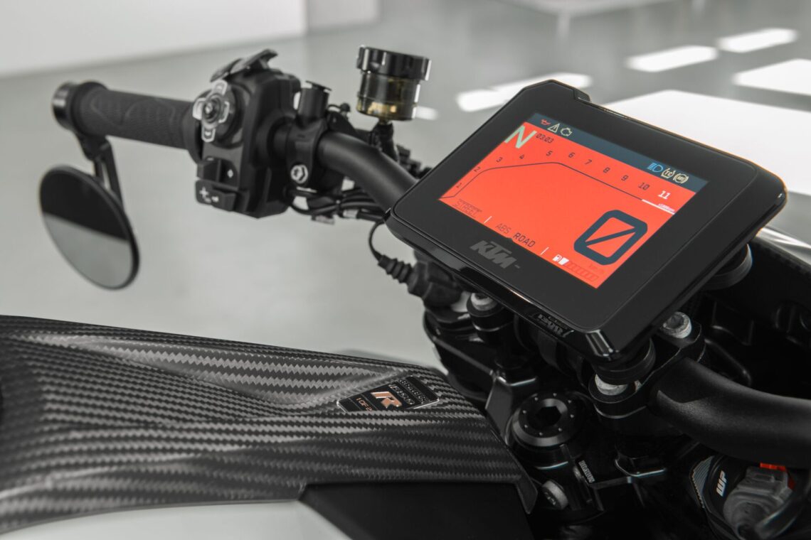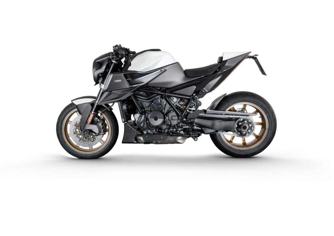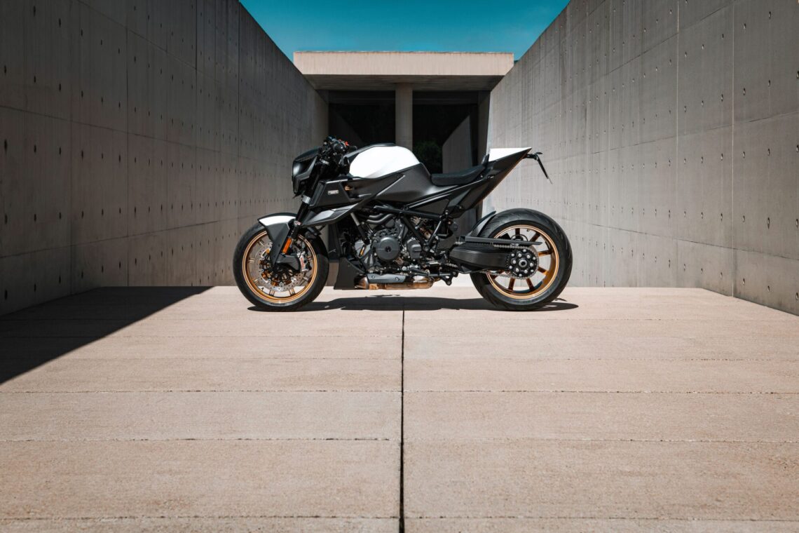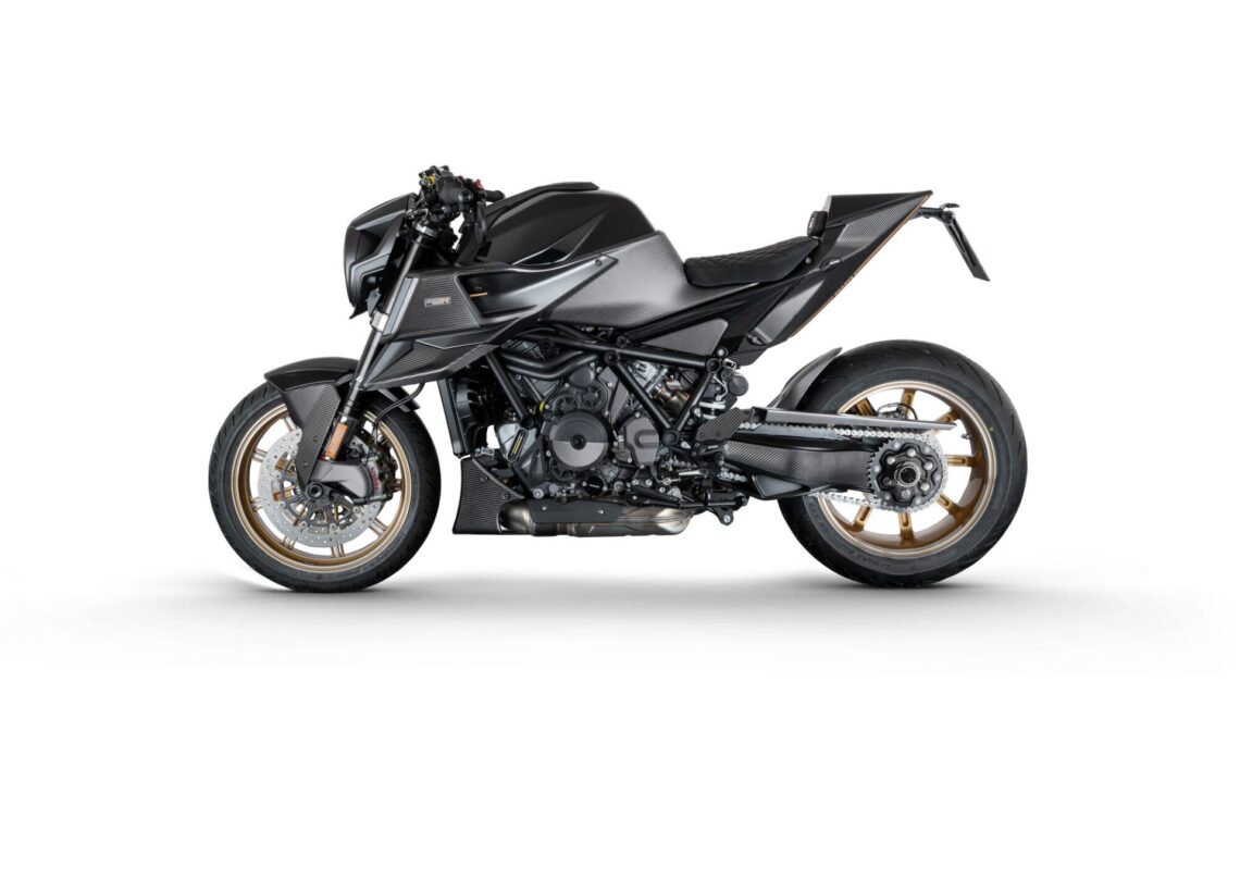 Hay que recordar lo que ofrece el propulsor austriaco LC8, un motor bicilíndrico en V de 1301 cc que rinde 132 kW (180 cv) a 9500 rpm y un par máximo de 140 Nm a 8000 rpm. Esto se traduce en una velocidad máxima de 270 km/h o aceleración de 0 a 100 km/h en sólo 3,2 segundos, igual que la Super Duke mencionada. El motor se incrusta dentro de un chasis multitubular en negro mate.