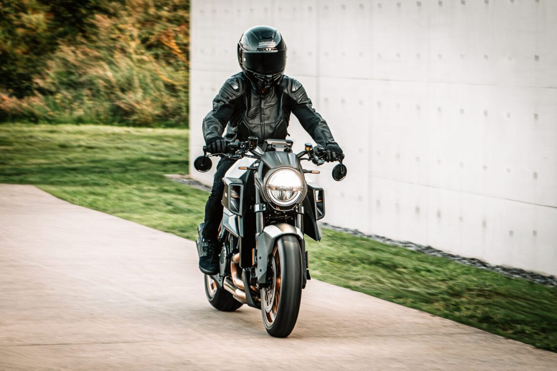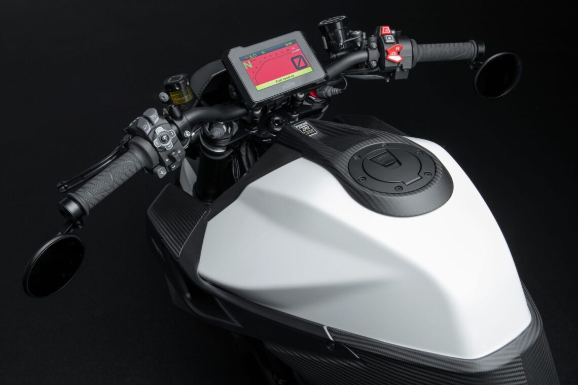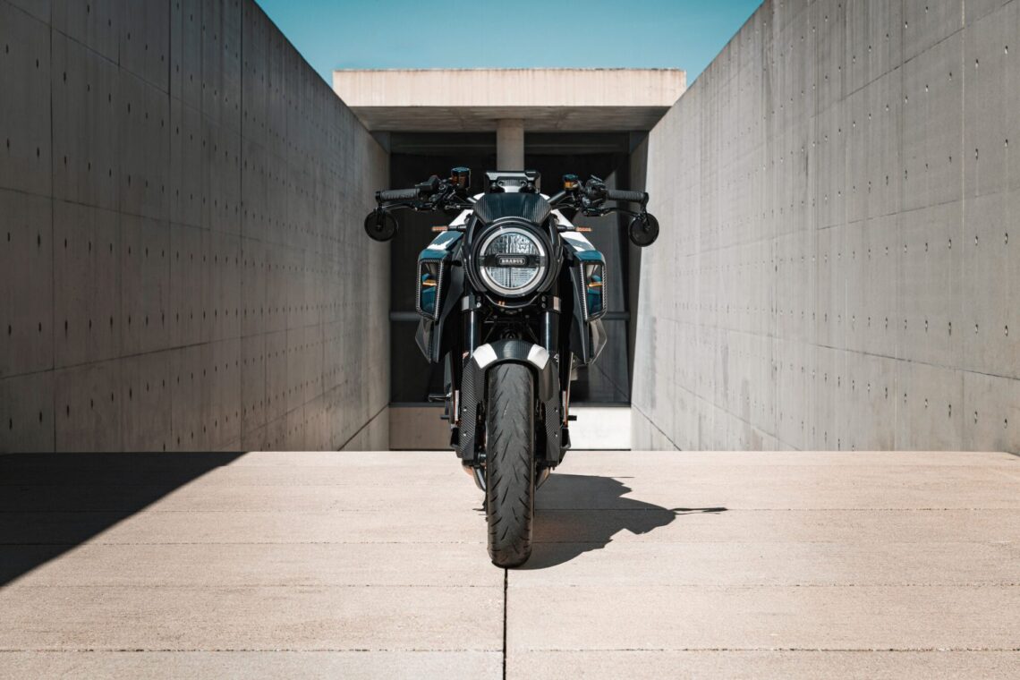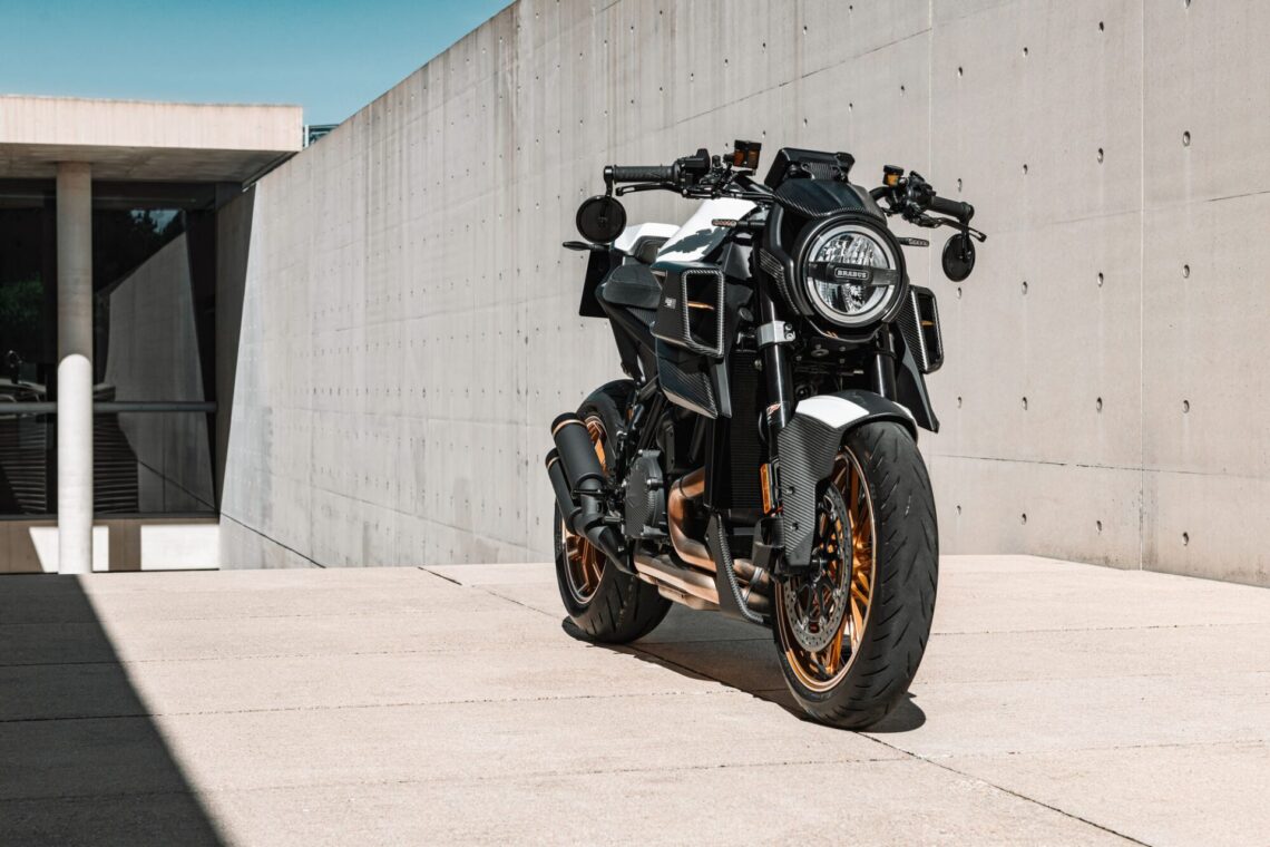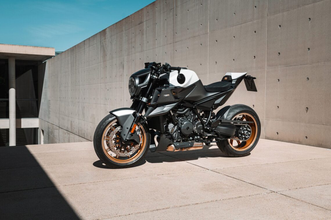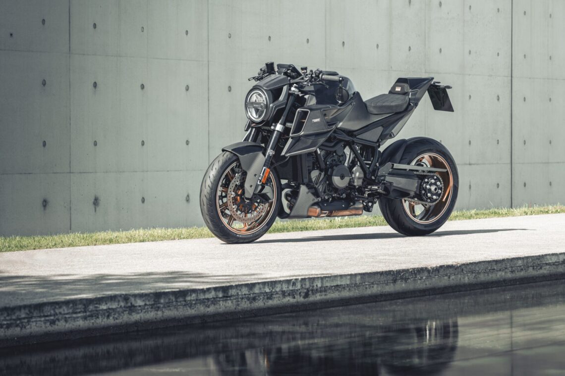 Hay que recordar lo que ofrece el propulsor austriaco LC8, un motor bicilíndrico en V de 1301 cc que rinde 132 kW (180 cv) a 9500 rpm y un par máximo de 140 Nm a 8000 rpm. Esto se traduce en una velocidad máxima de 270 km/h o aceleración de 0 a 100 km/h en sólo 3,2 segundos, igual que la Super Duke mencionada. El motor se incrusta dentro de un chasis multitubular en negro mate.