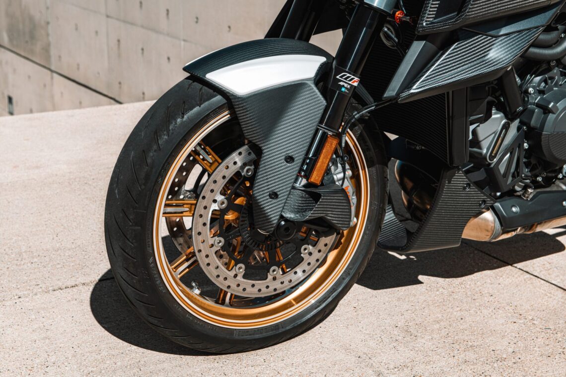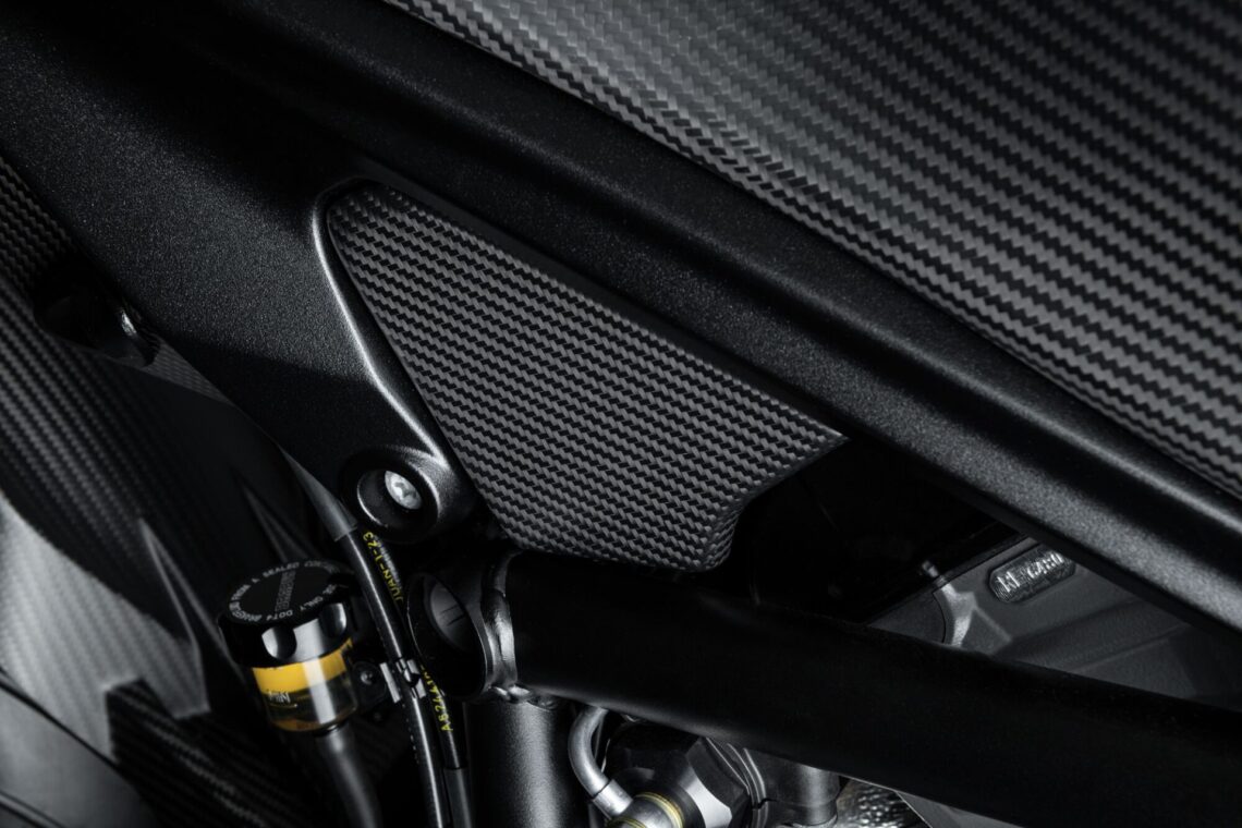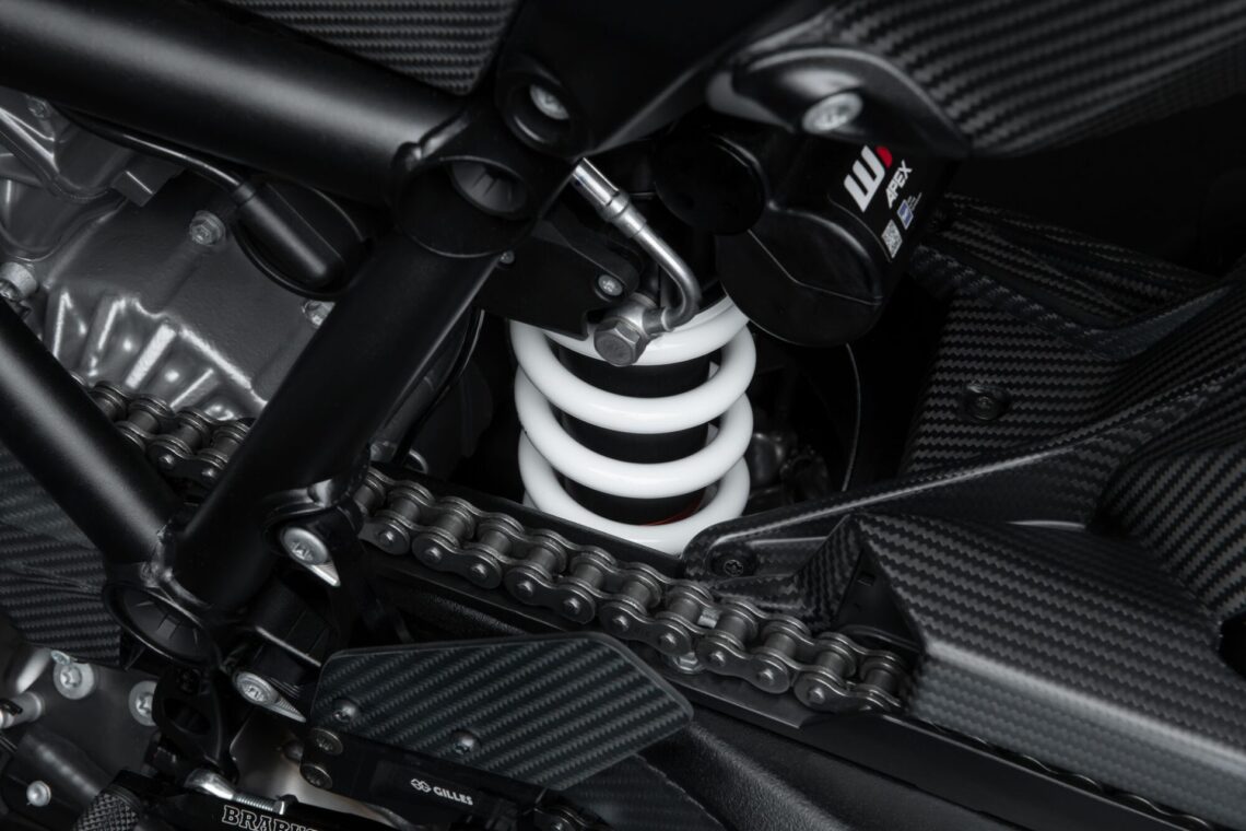 Las suspensiones utilizadas son semiactivas firmadas por WP son de corte deportivo, con modo Auto, que se adaptan de forma independiente a las condiciones de la carretera y al estilo de conducción. Mediante un botón, puedes elegir otras configuraciones, entre las que buscar el máximo confort o ir hasta el máximo aplomo ideal para el circuito. Se combina con un amortiguador de dirección del catálogo de WP Pro Components (WP APEX PRO 7117). Por supuesto, el equipo de frenos está firmado por Brembo con las avanzadísimas pinzas Stylema.