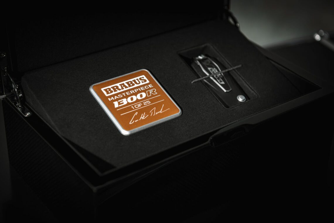 Cada unidad se entrega con accesorios exclusivos. incluye una funda para interior hecha a medida y una estera para el suelo del garaje de casa, por supuesto ambos con emblemas dorados de BRABUS MASTERPIECE. La llave viene en una exclusiva caja de carbono con el logotipo de esta edición limitada. Por último, cada uno de los 50 propietarios podrán disfrutar de una exclusiva visita guiada a las instalaciones de BRABUS Manufaktur de Bottrop (Alemania).