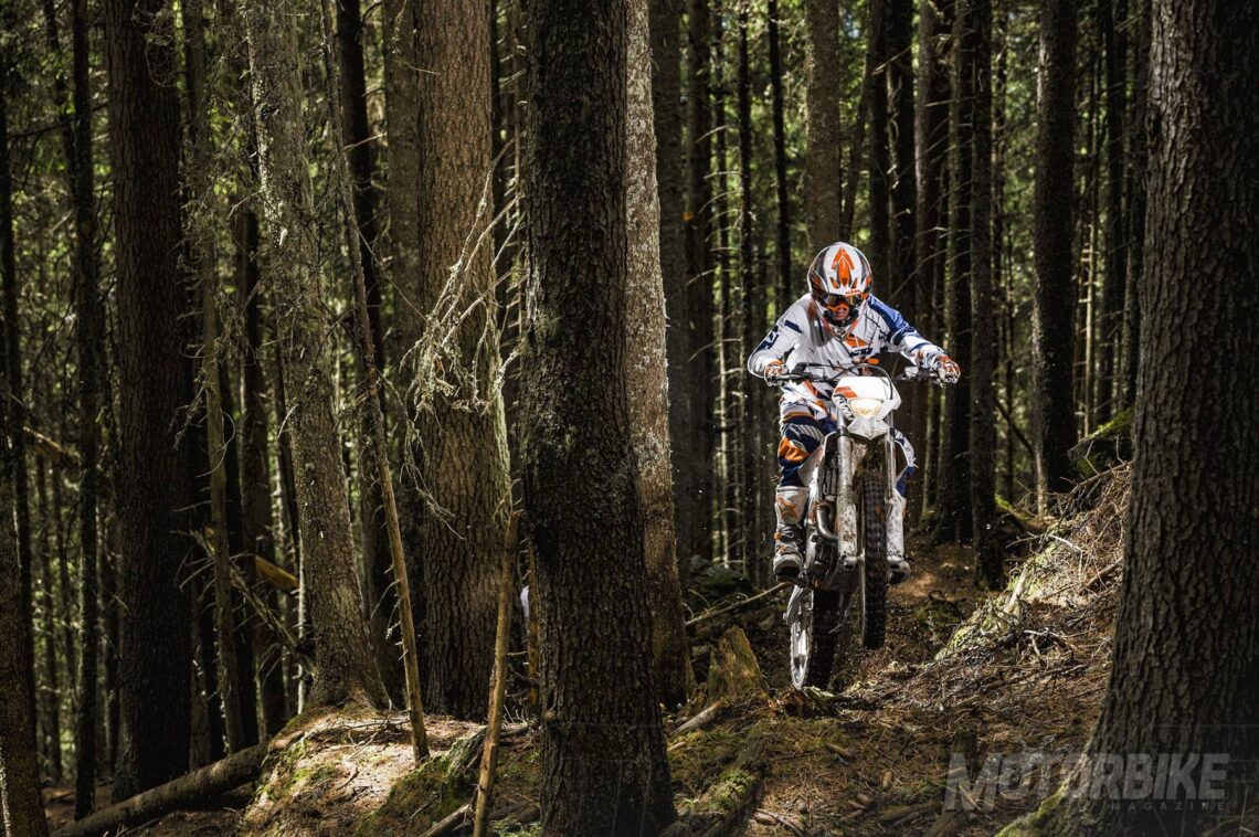 Esto no quita para que a la KTM Freeride 250 R no se le ponga obstáculo por delante y sea capaz de ir por sitios que no te podrías ni imaginar. Las dos primeras marchas son muy cortas, ideales para las zonas difíciles, mientras que luego las marchas son más largas para rodar incluso por carretera.