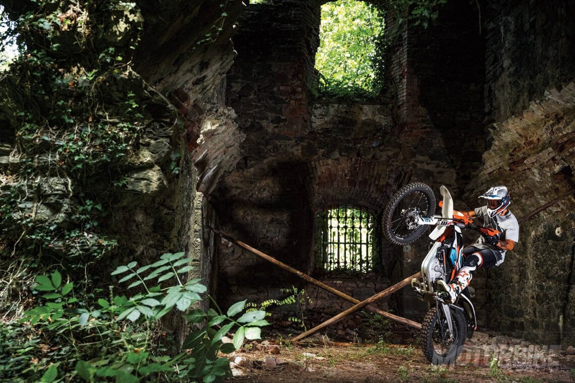La KTM Freeride E-XC es muy fácil de utilizar, sin embrague ni palanca de cambio, con una altura del asiento de 900 mm y una gran agilidad. La llave de contacto se ha recolocado en un lateral bajo la instrumentación.