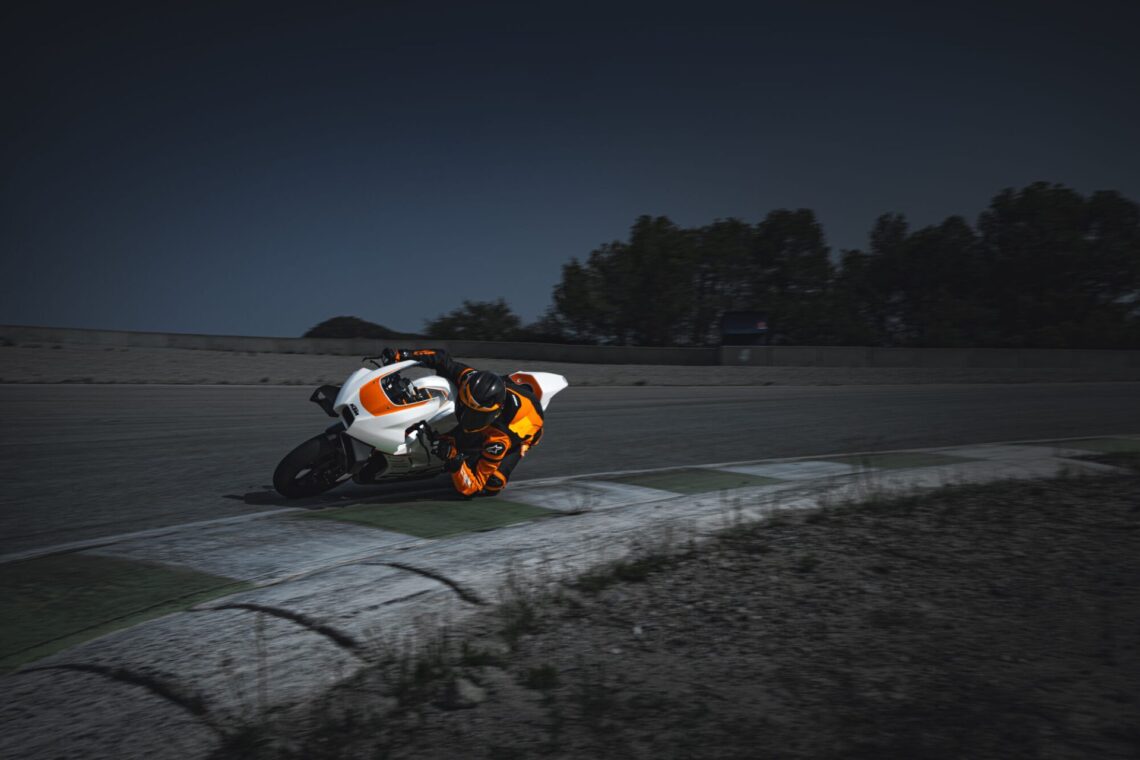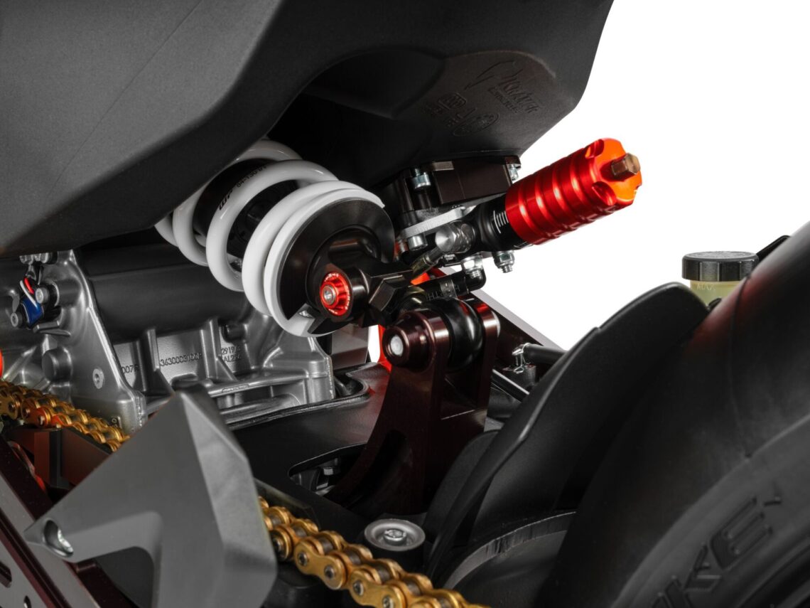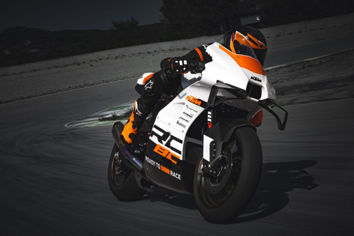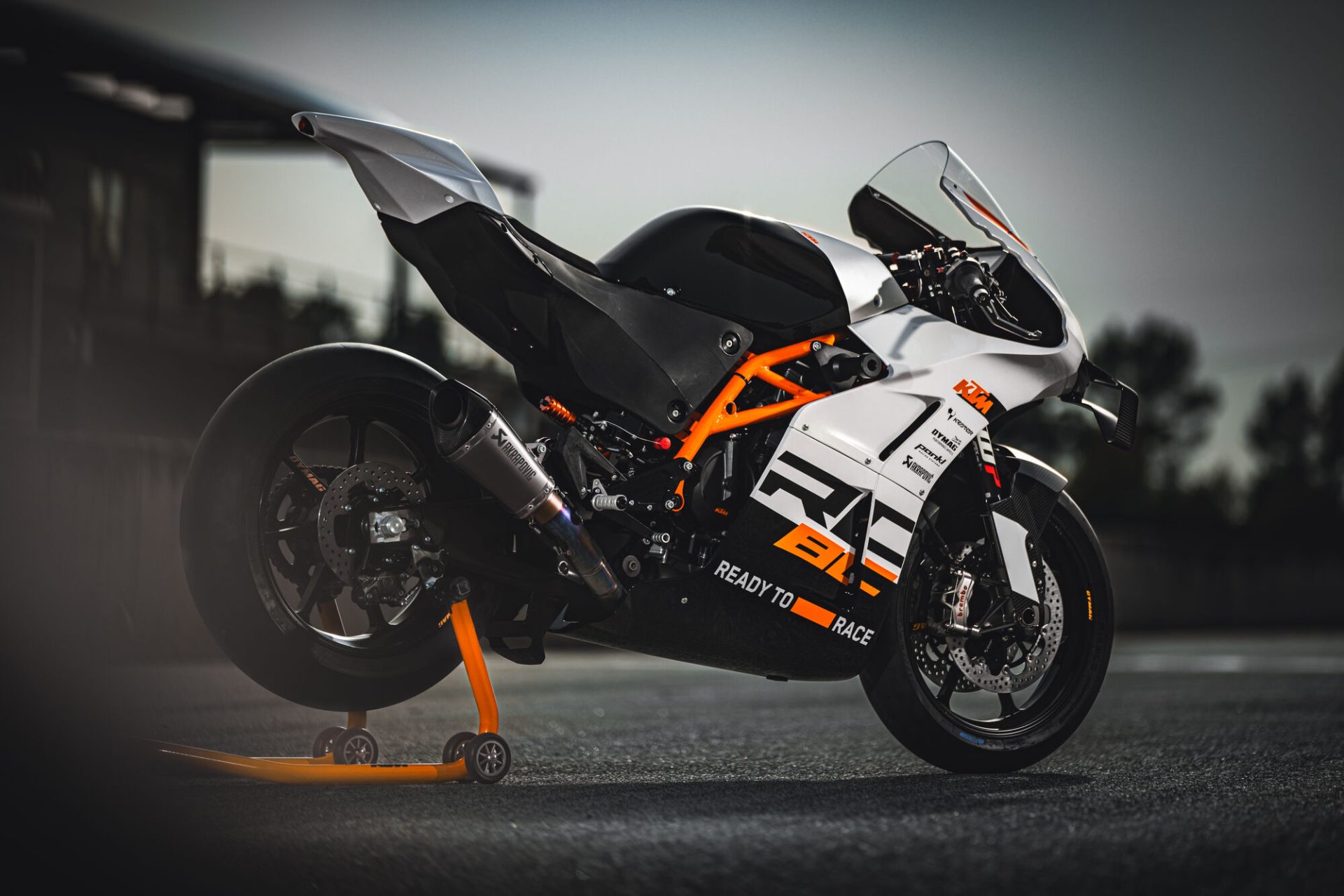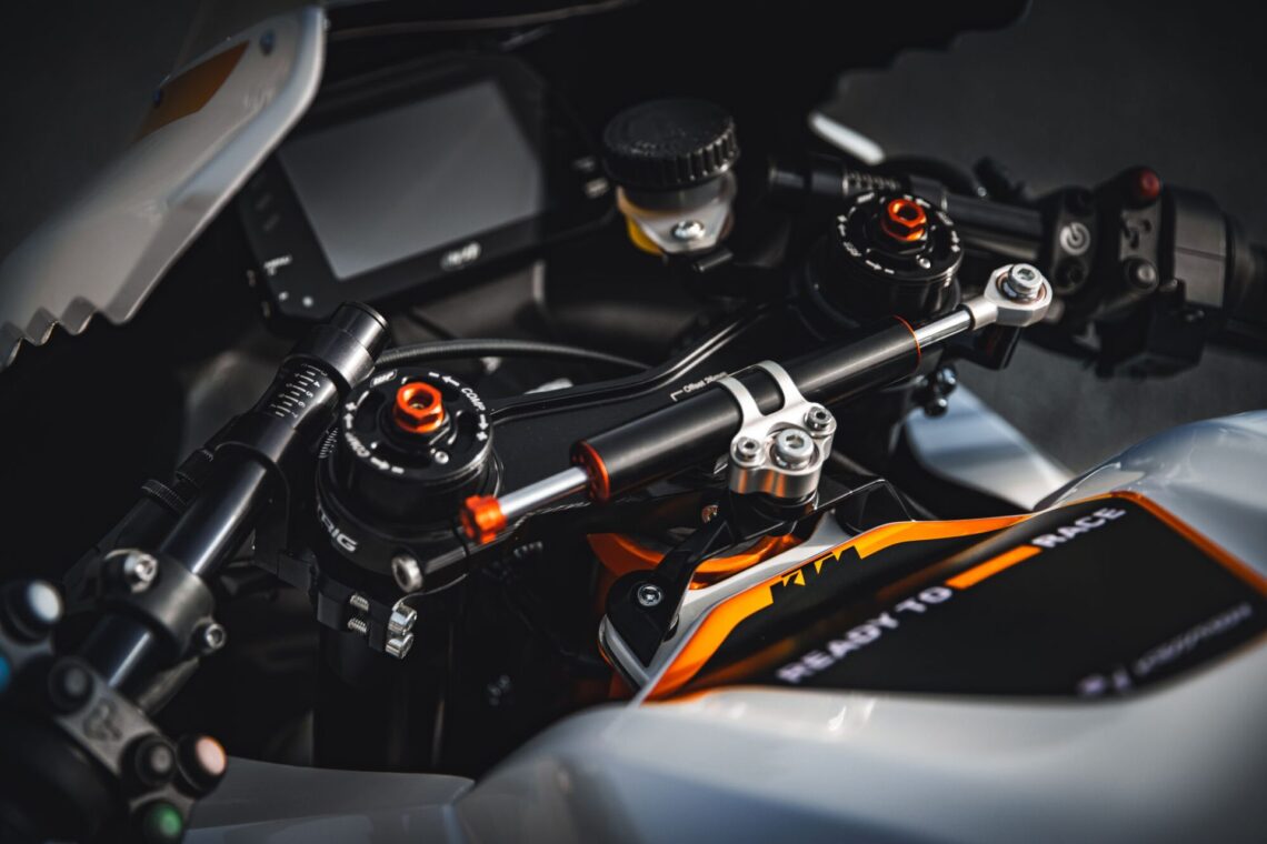 La carrocería está hecha en carbono kevlar, con un diseño que se inspira en la KTM RC16 de MotoGP. Confía en el motor LC8c bicilíndrico en paralelo de 889 cc, doble árbol de levas, 8 válvulas y con un rendimiento de 130 cv de potencia y 98 Nm de par. Componentes como el filtro de aire y su caja del filtro son específicos de competición. Con un peso en seco de 142 kg, estamos cerca de una relación potencia-peso 1:1.