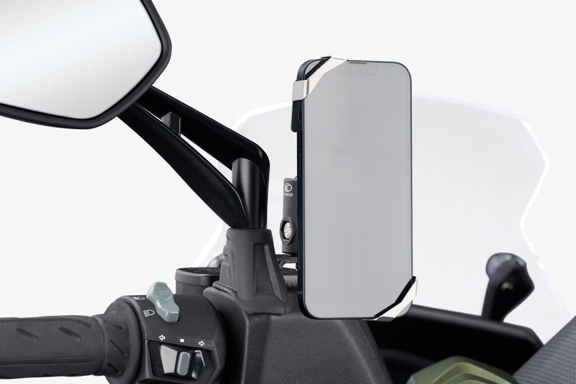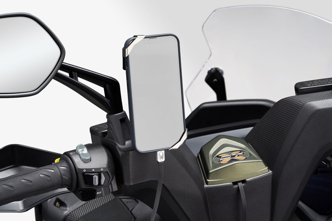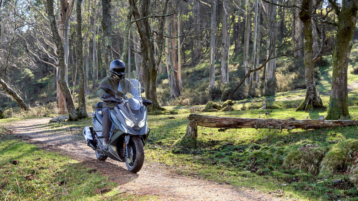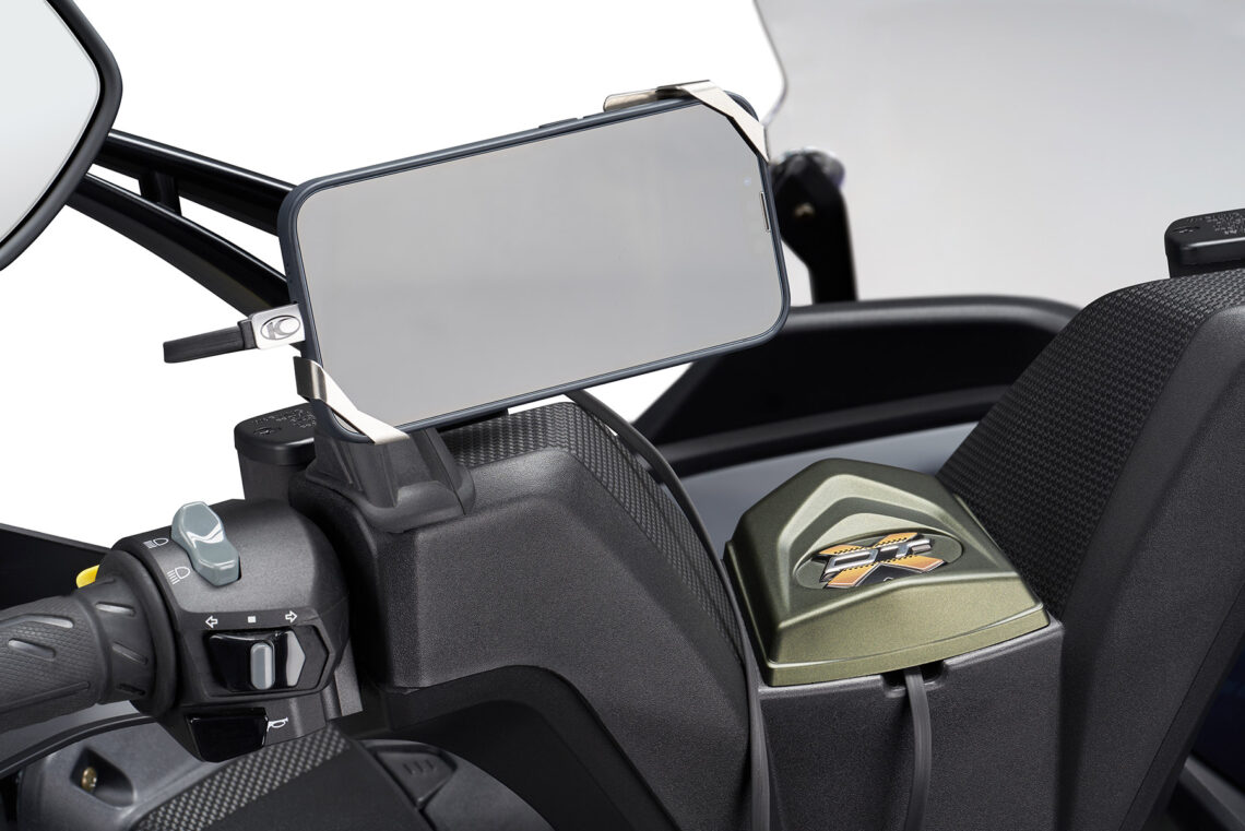 No hay que olvidar la extensa lista de accesorios que le puedes instalar como extra: defensas laterales de acero galvanizado con anclajes ocultos, parabrisas DTX de mayor superficie con curvatura más envolvente que la original (545 mm de longitud y 410 mm de ancho) fabricada en policarbonato de gran calidad óptica y con tratamiento antiarañazos, cubremanos, respaldo para el pasajero, soporte para el teléfono móvil fabricado en acero inoxidable y aleación de aluminio con sistema antirrobo (solo es desmontable con una llave específica de serie) y candado de seguridad y un baúl original KY30 para guardar el casco integral modular, el de mayor volumen.