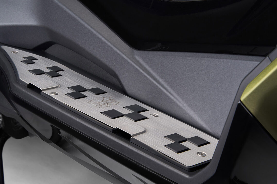 Un detalle del nuevo DTX y que es exclusivo del mercado español es que viene con el conjunto de reposapiés superiores e inferiores (4 unidades) fabricados en aluminio anodizado y equipados con tacos de goma antideslizantes, un detalle más aventurero y que ofrece un plus de agarre.