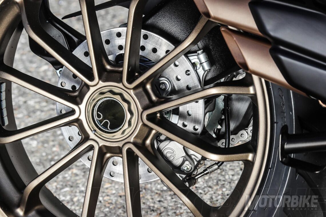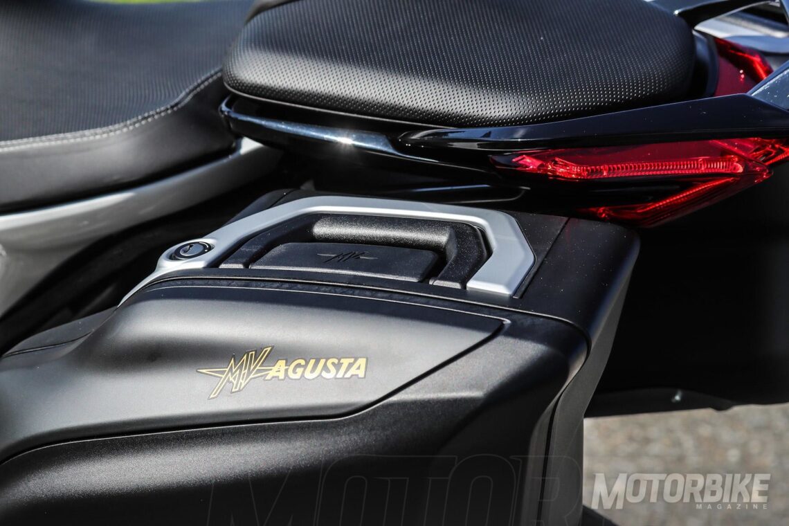 La MV Agusta Turismo Veloce 800 Lusso SCS llega con un freno de estacionamiento para evitar movimientos no deseados cuando la moto está parada. De hecho, el embrague automático no deja que la transmisión siga engranada cuando el motor no funciona. Este freno se activa o desactiva accionando con el pie una leva encima de la leva del freno trasero, en el lado derecho de la moto.