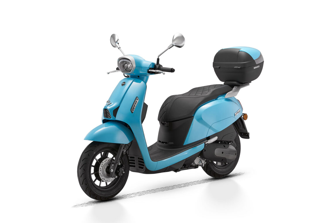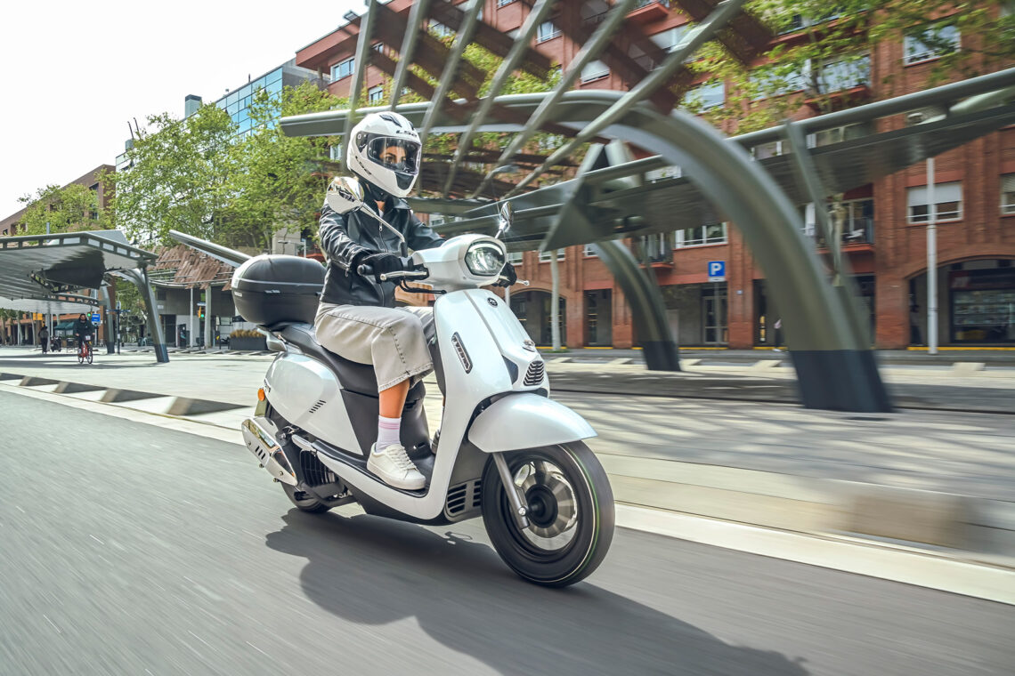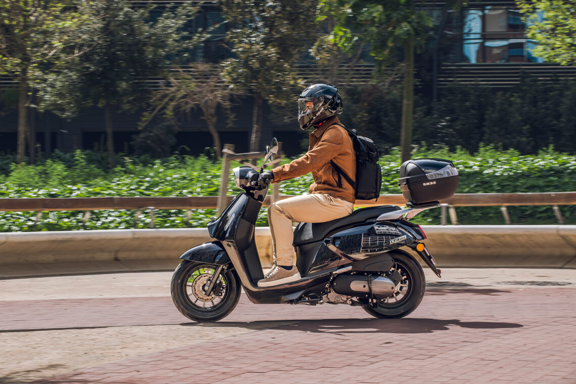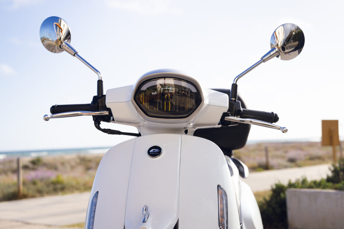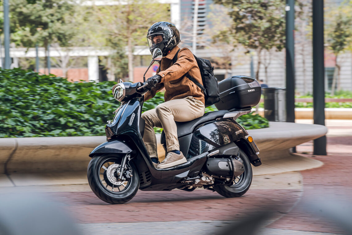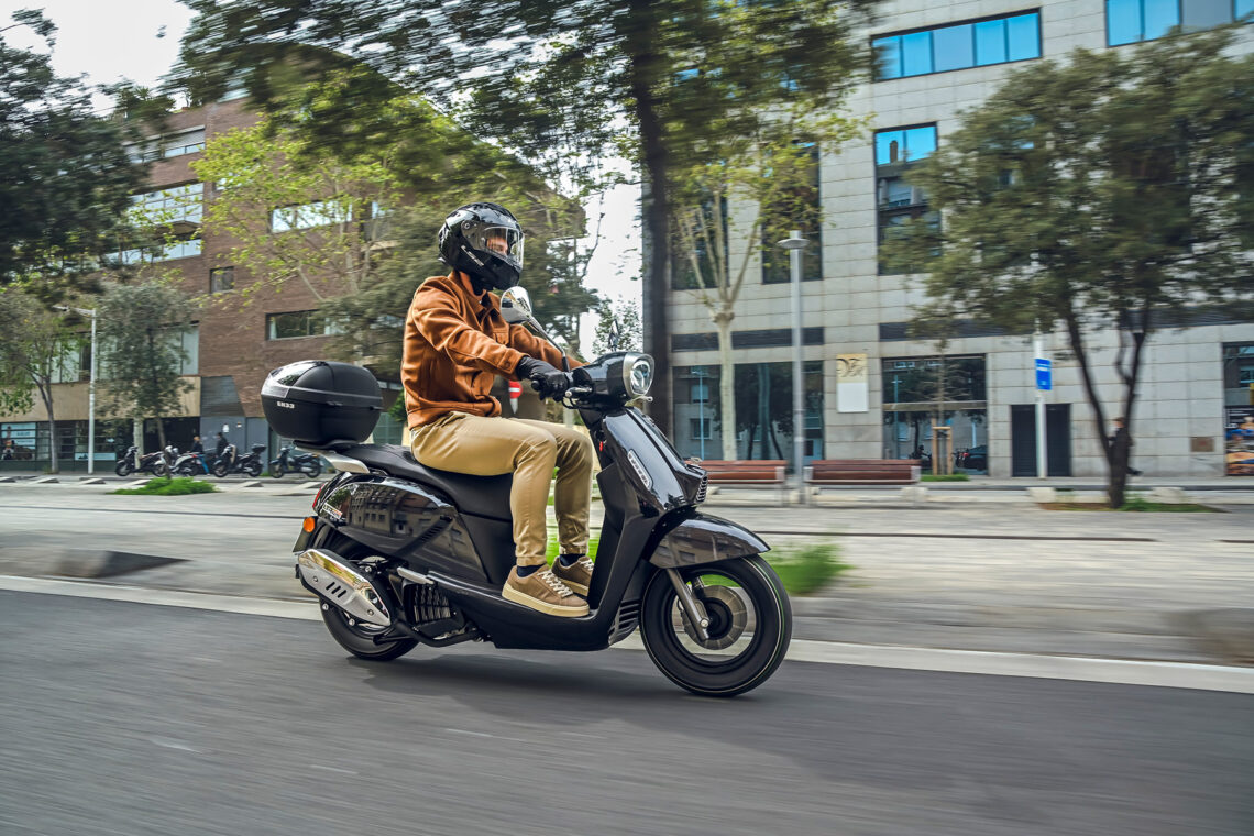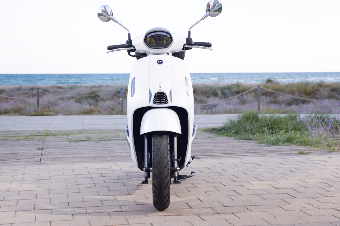 Destaca por su agilidad, con solo 71 cm de anchura y ruedas de 100/90-12” o 90/90-12” delante y 110/90-12” detrás. Con un peso de 118 kg, es perfecto para la conducción urbana. Su suspensión, con horquilla telescópica delantera y monoamortiguador hidráulico trasero, junto con frenos de disco de 220 mm y 190 mm con ABS, aseguran confort y seguridad.