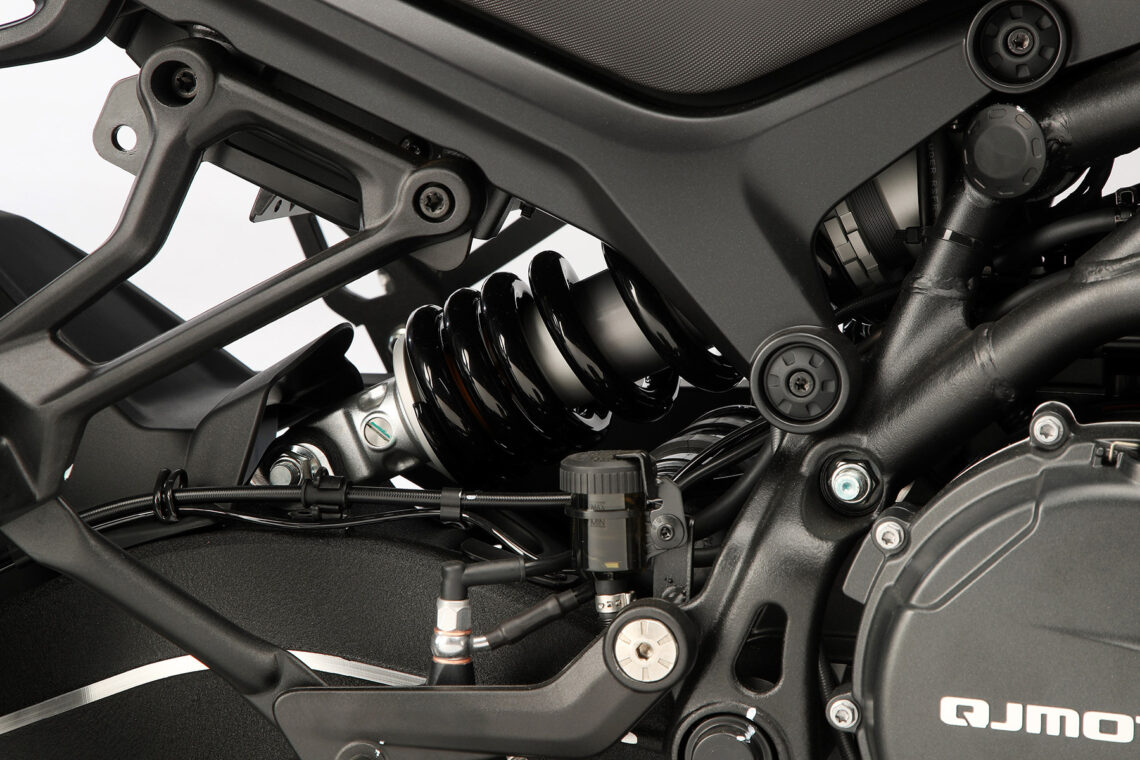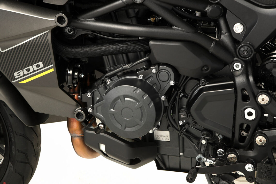 El primer salto que da esta QJ SRT 900SX respecto a sus predecesoras está en el motor. Sigue confiando en la configuración de propulsor bicilíndrico en línea, pero ahora creciendo hasta los 904 cc. Refrigerado por líquido, DOHC y 8 válvulas, declara 95 cv a 9000 rpm, consiguiendo así llegar casi al límite para poder ser limitable para el carnet A2. También eleva su par máximo hasta los 90 Nm a 6.500 rpm. Su comportamiento se puede modular gracias a la instalación de tres modos de conducción (Normal, Sport y Rain), los cuales controlan la respuesta del motor.