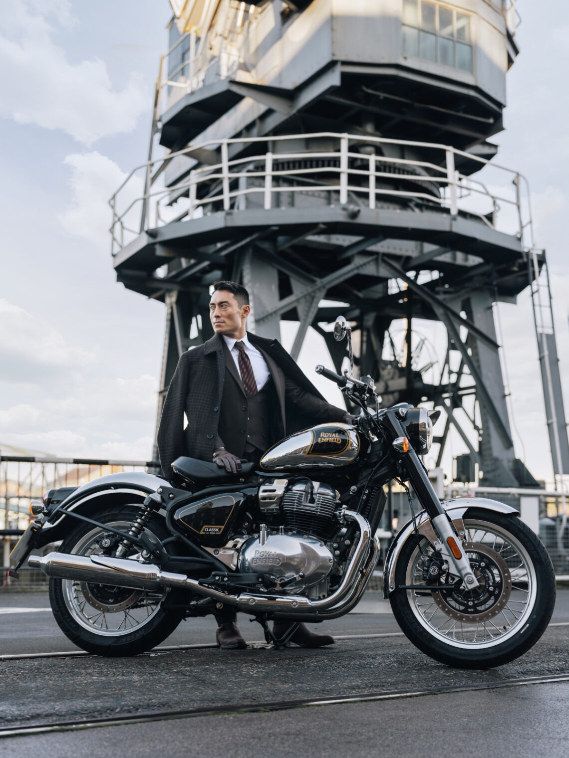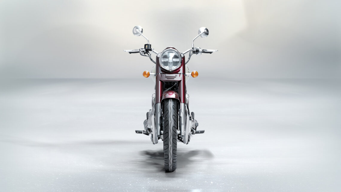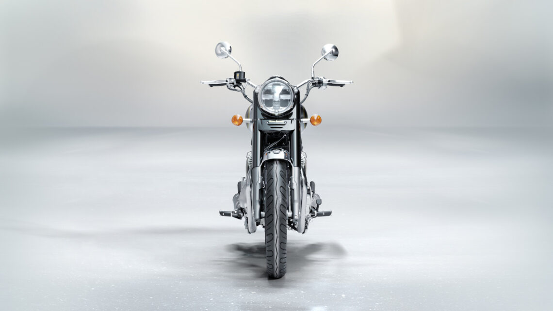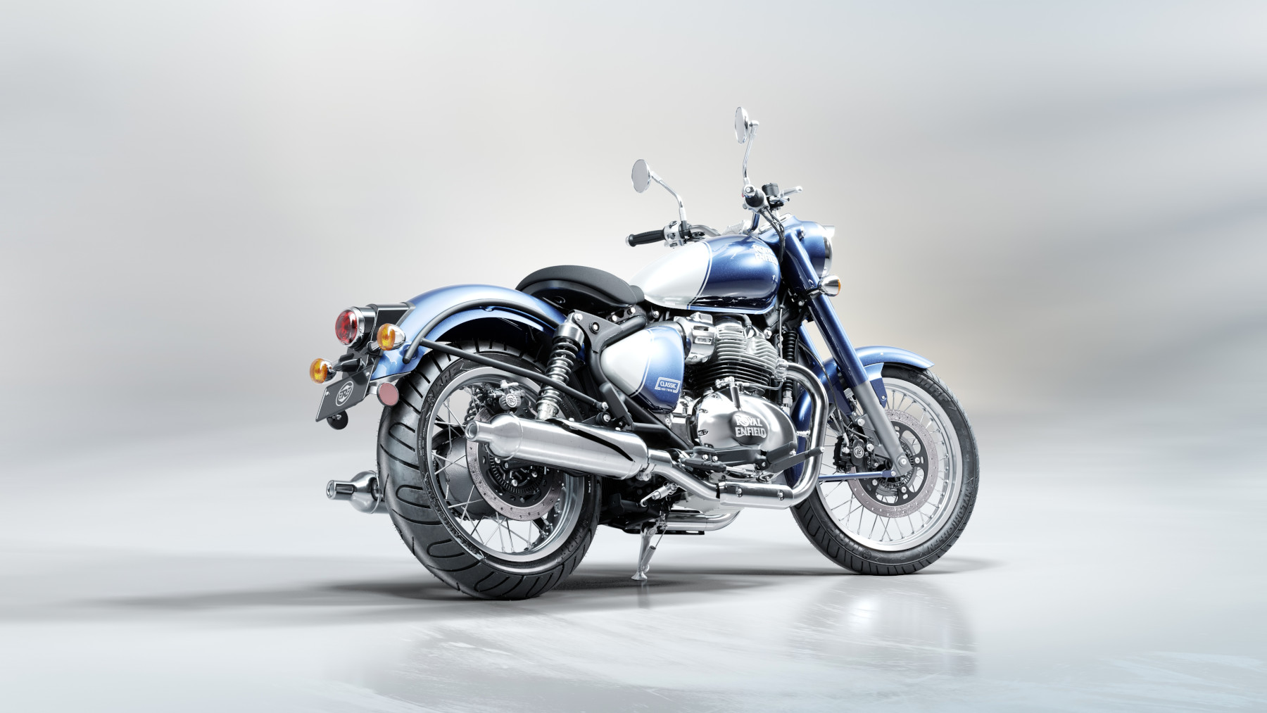 Los nuevos neumáticos anchos, más modernos, complementan las capacidades de la moto, cuyas formas más voluminosas le confieren una presencia acorde con la mayor cilindrada del motor. También cuenta con el emblemático depósito de combustible en forma de lágrima y la carcasa característica de Royal Enfield en la que se aloja un faro LED junto con las luces, un rasgo que perdura en las motocicletas Royal Enfield desde 1954.
