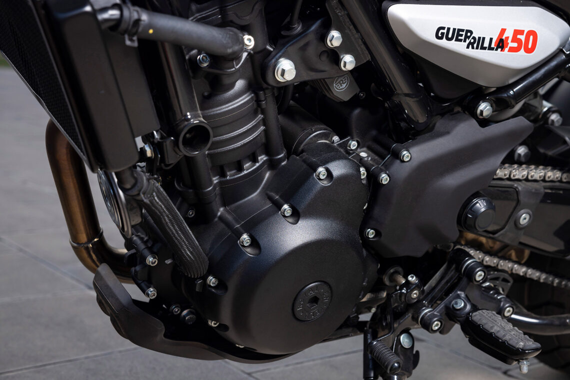 La Royal Enfield Guerrilla 450 equipa el mismo motor monocilíndrico 'Sherpa' de 452 cc con refrigeración líquida ya visto en la Royal Enfield Himalayan 450. Hablamos de un propulsor DOHC 4 válvulas con 40 CV a 8.000 rpm y 40 Nm de par a 5.500 rpm (el 85 % está disponible desde 3.000 rpm). Se completa con acelerador electrónico, doble modo de conducción (Eco y Performance), caja de cambio de 6 velocidades y embrague antirrebote asistido.