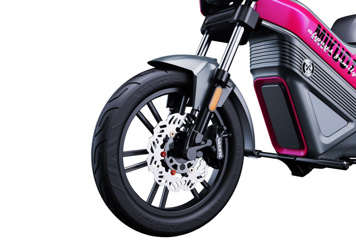En la parte baja del Sunra Miku 1, vemos colgar la batería de litio de 48 v y 25 ah que le permite tener una autonomía máxima de 60 kilómetros. El motor tiene un rendimiento de 1200 W (1,60 cv) que le permite alcanzar con solvencia la velocidad máxima permitida para los ciclomotores, es decir, 45 km/h.