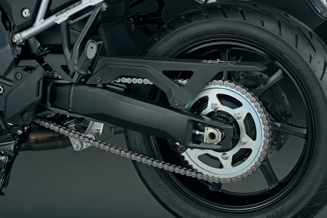 Entre las diferencias que muestra la Suzuki V-Strom 800 Tech respecto a su hermana DE, lo más destacable es que monta una rueda delantera de 19", lo que le aporta una mayor versatilidad y un mejor comportamiento asfáltico. A ello también ayudan las llantas de aleación tipo tubeless o el menor recorrido de suspensiones (150 mm en ambos ejes frente a los 220 de la DE). Esto le permite bajar la altura libre al suelo 35 mm menor (185 mm) mientras que la altura del asiento también baja, quedando a 825 mm, mucho más accesible para todo tipo de usuarios.