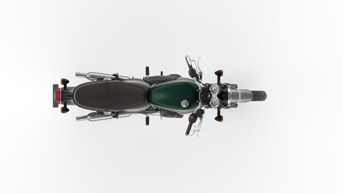 Estos detalles los vemos en el depósito de gasolina, el guardabarros delantero y trasero y los paneles laterales, todos ellos en color Silver Ice combinado con una franja ancha longitudinal del depósito en color verde Competition Green, con los bordes dorados pintados a mano y un sutil gráfico 'Gold Line'. El verde también está en los paneles laterales con los bordes dorados, donde también vemos exclusivos logotipos Bonneville T100 en blanco y dorado.