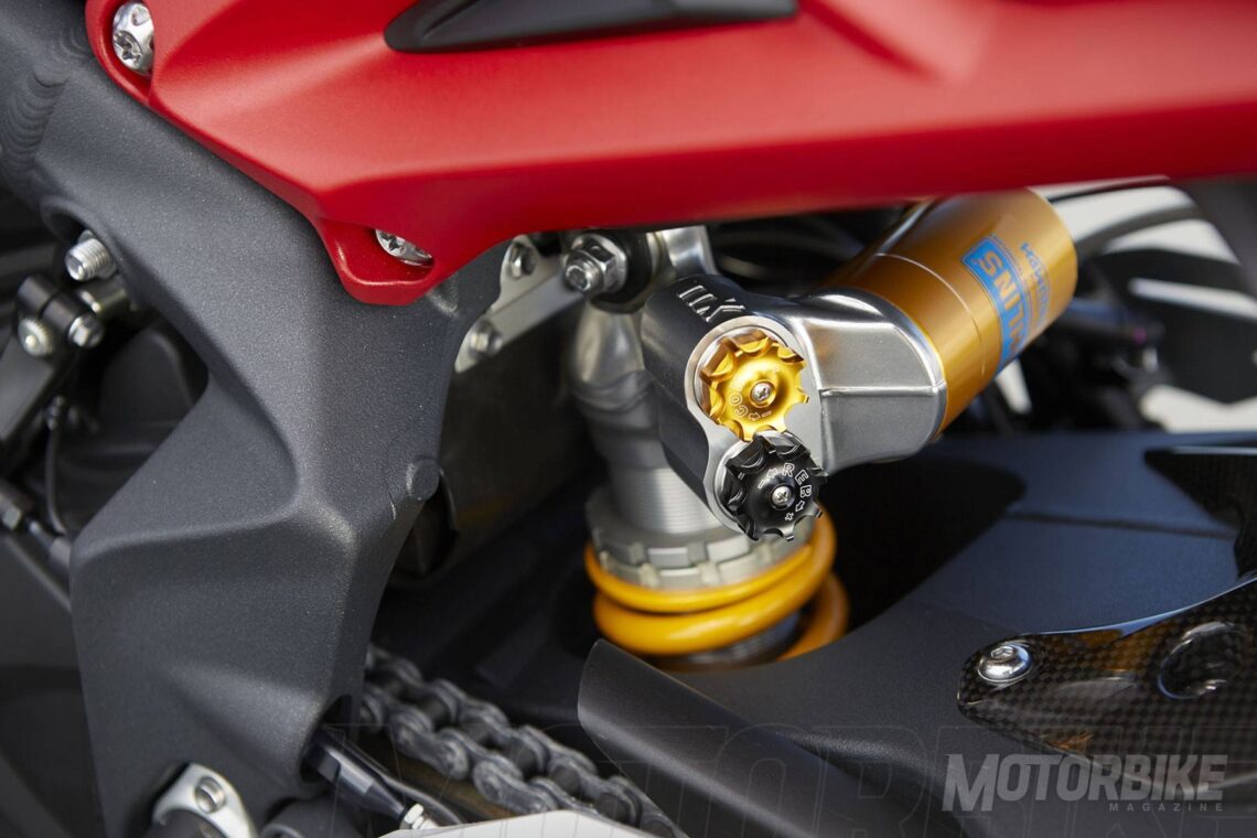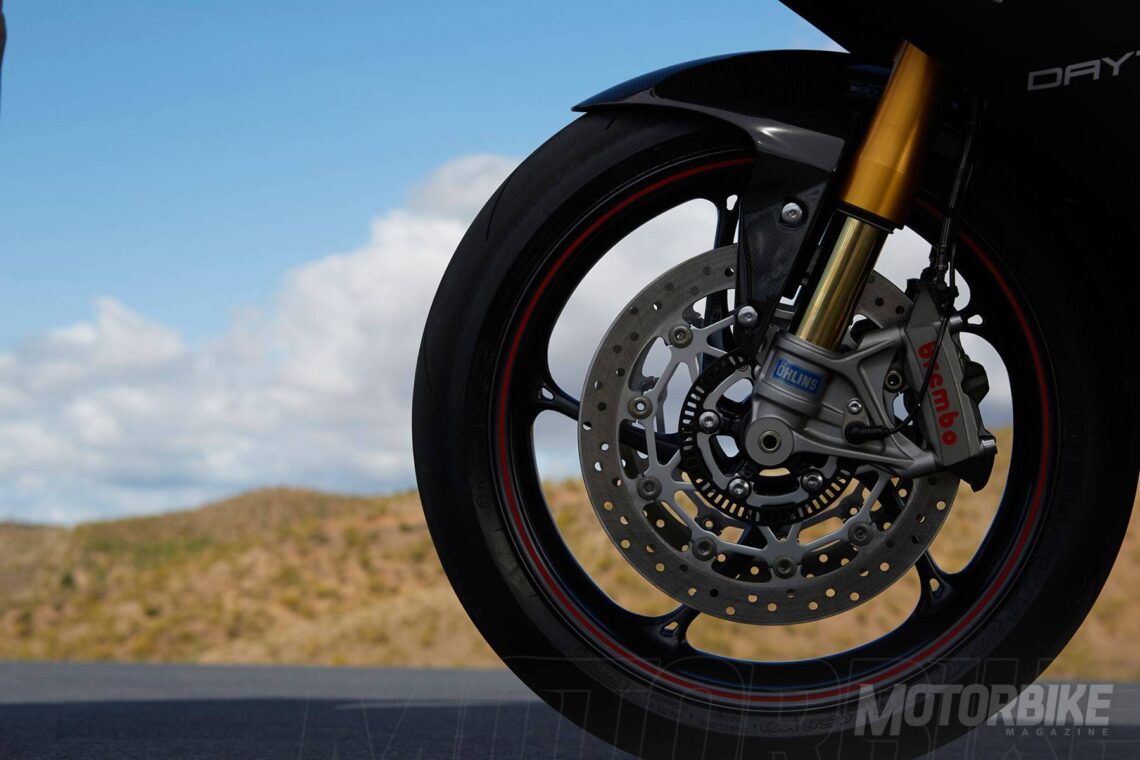 | Suspensión trasera | Mono-Amortiguador Öhlins con depósito de gas independiente de doble cámara, ajustable en extensión y compresión. Recorrido de la rueda trasera: 133 mm |