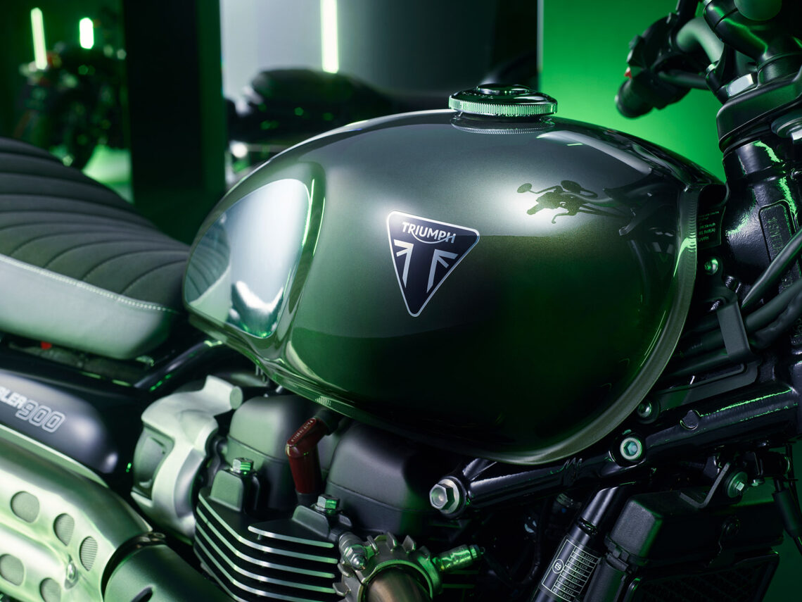 El estilo todoterreno de la Triumph Scrambler 900 Chrome Edition viene ensalzado por un depósito en verde Brooklands Green con una franja en negro Jet Black y la zona de las rodillas con un acabado metálico Chrome Edition. En los laterales vemos las insignias triangulares de la marca con detalles metálicos. El contraste viene dado por el negro de los guardabarros, los paneles laterales y el embellecedor trasero. En el nuevo kit de accesorios específicos hay que destacar un guardabarros alto en color Jet Black y la pantalla en Brooklands Green a juego.
