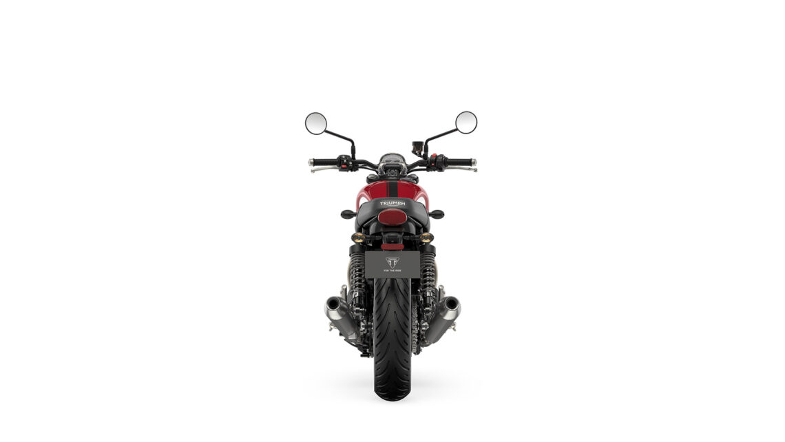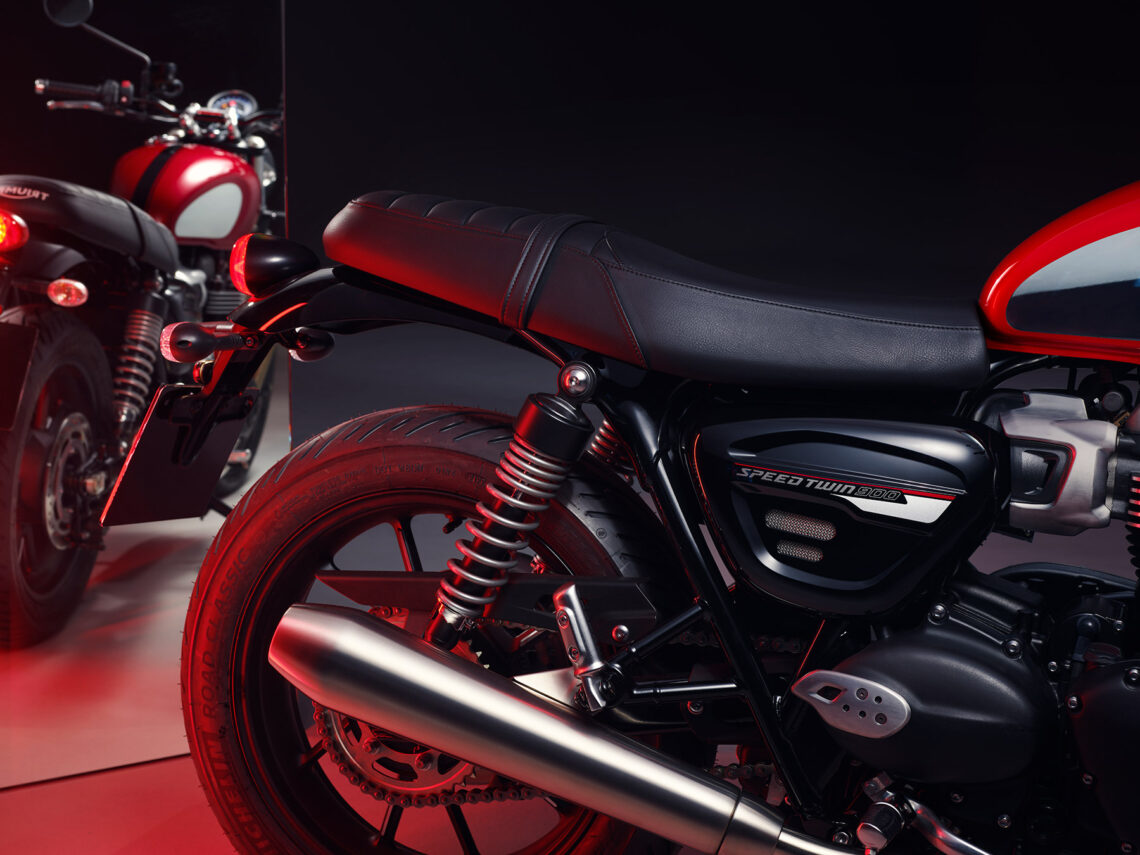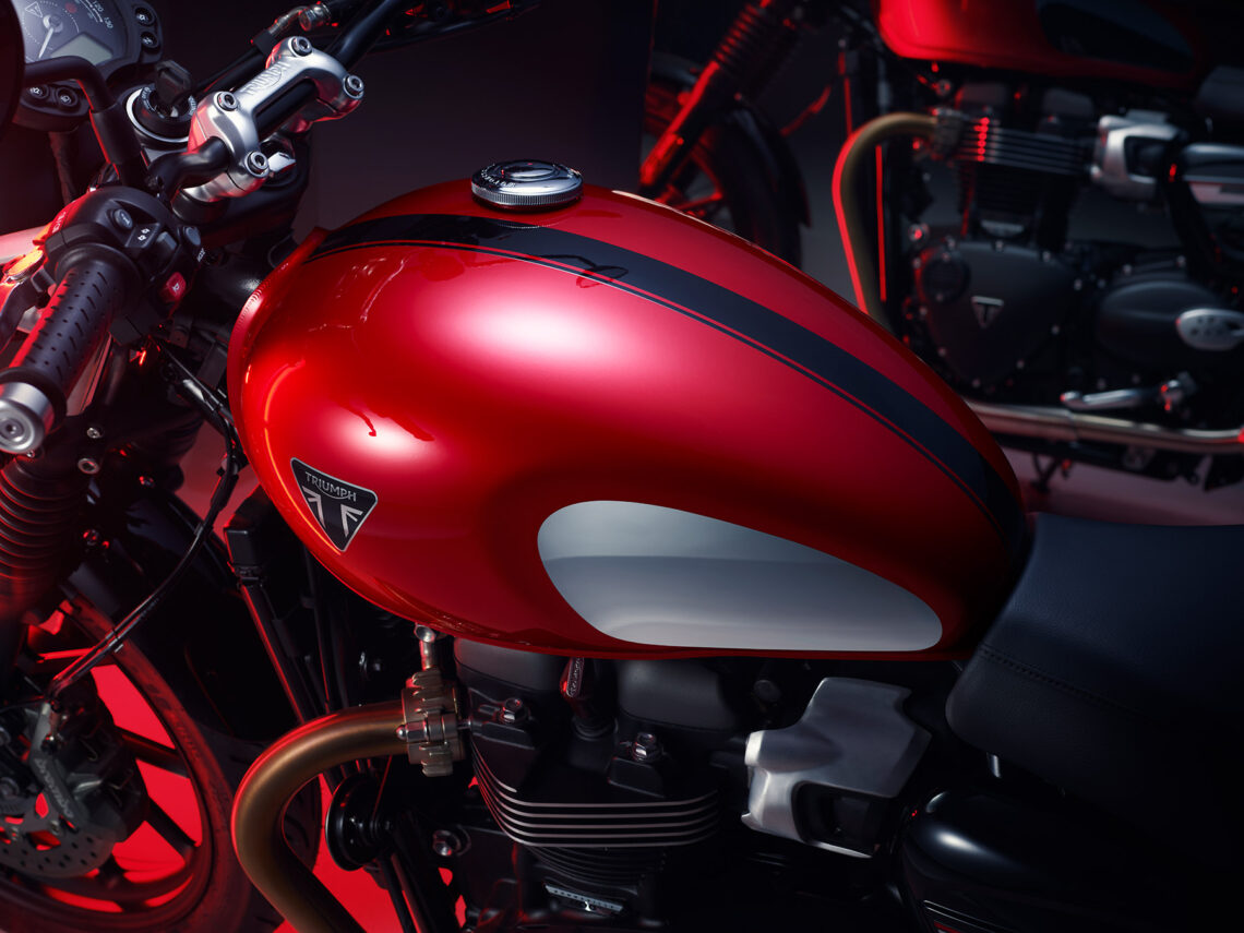 La Triumph Speed Twin 900 Chrome Edition destaca por un esquema cromático en rojo Red Hopper con una franja en negro Jet Black además de una zona de las rodillas en acabado metálico Chrome Edition a juego con las nuevas insignias triangulares de Triumph con detalles metálicos en los laterales del depósito. En los paneles laterales en negro Jet Black vemos también nuevos gráficos en rojo y plata, mientras que los guardabarros también son en este negro. Entre los nuevos accesorios disponibles, hay que destacar una pantalla opcional en Red Hopper a juego.