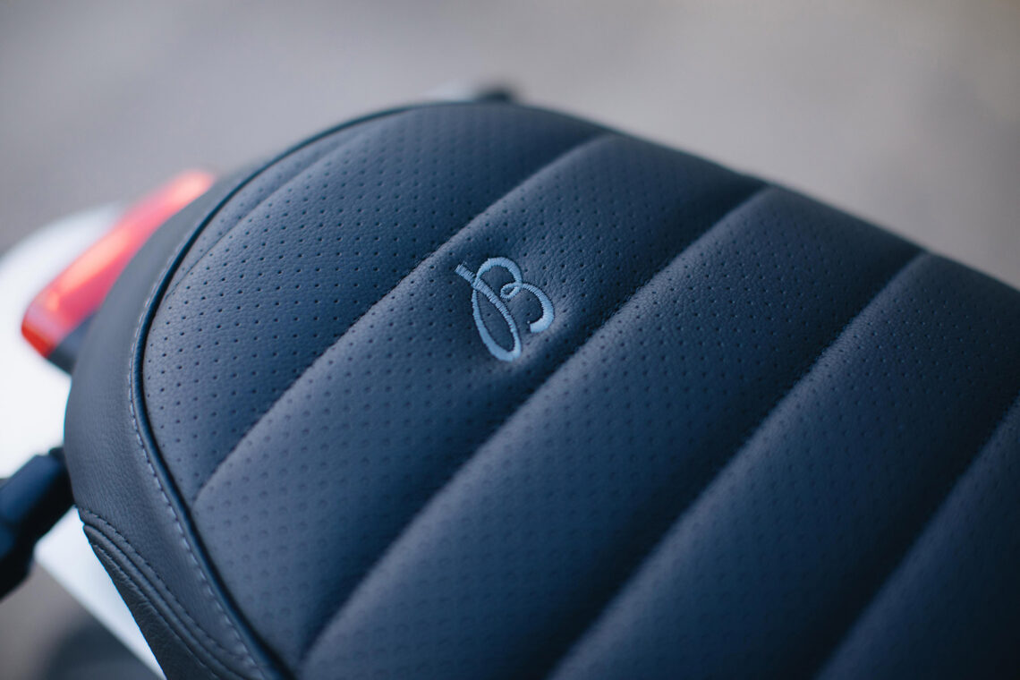 Otros detalles que no deben pasar desapercibidos están en la personalización de las tapas de motor con el emblema de la firma relojera y las esferas del panel de instrumentos, que comparten detalles de estilo con los de la esfera del cronógrafo Breitling Top Time Triumph. También se ha instalado un nuevo asiento de cuero negro perforado a juego con la correa del Breitling Top Time que luce detalles acanalados acolchados y una elegante "B" de Breitling bordada.