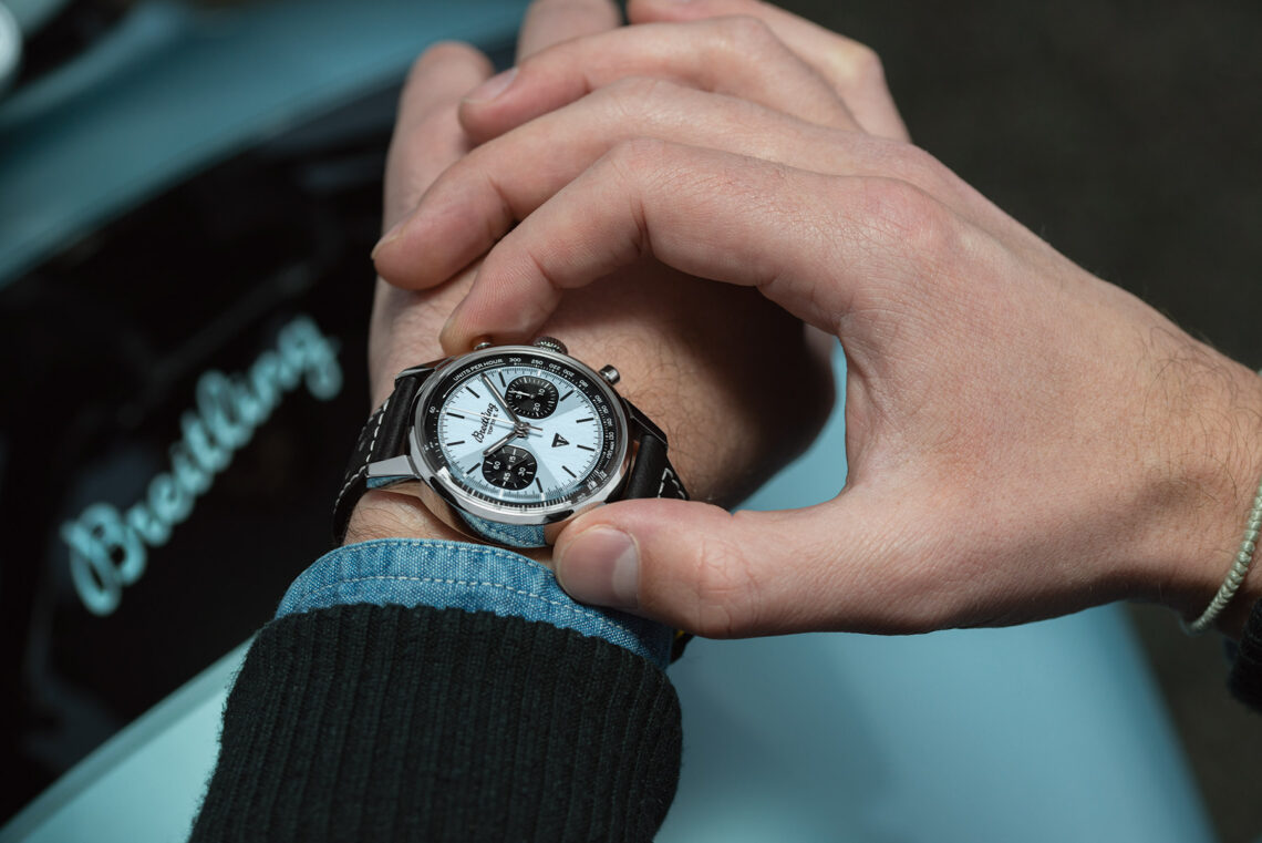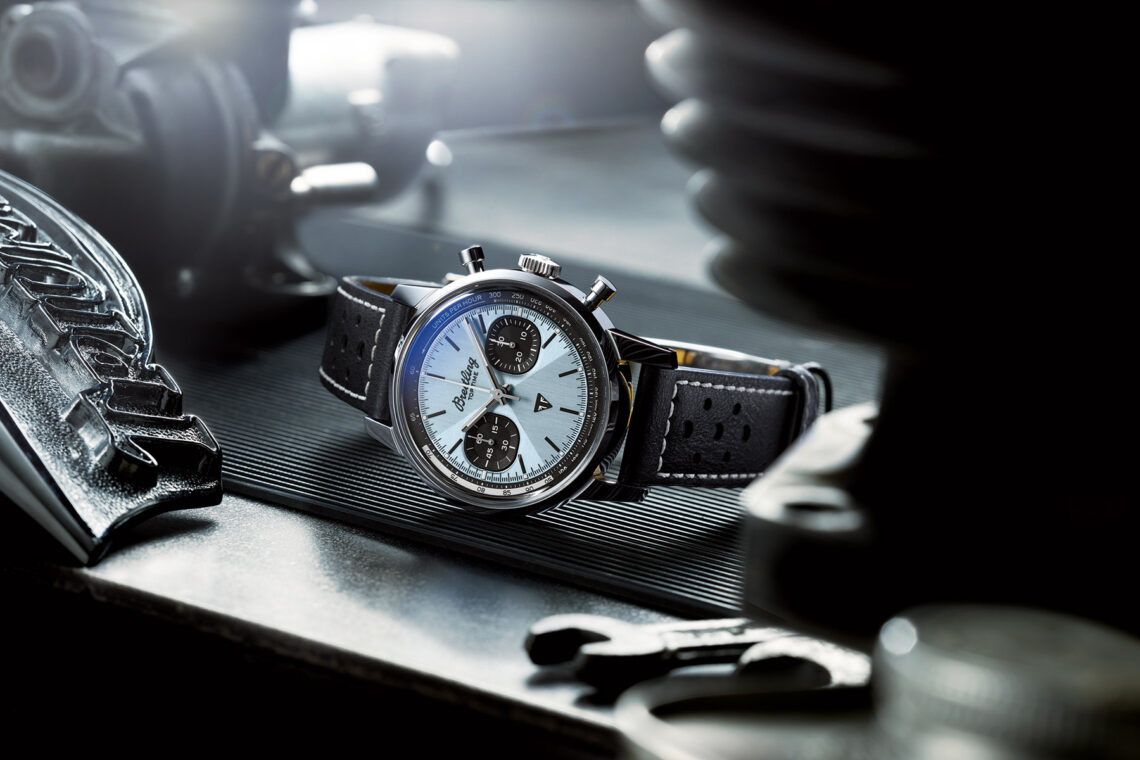 Por su parte, el cronógrafo de alta precisión Breitling Top Time Triumph Edition no es sólo un simple reloj para ver la hora, cronometraje y velocidad de seguimiento. Se trata también de una pieza de coleccionismo gracias a sus elegantes detalles de diseño. Las dos versiones del cronógrafo destacan por el mencionado color azul hielo de la Thunderbird 6T de 1951, pero también inspirado por el excepcional Breitling Top Time 815 con esfera azul de la década de los años 70. La correa de piel de becerro con motivos de competición hace que el dial destaque. Los logotipos de Breitling y Triumph se ubican sutilmente a las 12 y las 6 en punto. Detrás de la caja de los relojes, está grabado con un boceto el icónico motor bicilíndrico en paralelo de Triumph, todo un símbolo de calidad y cuidado del detalle.