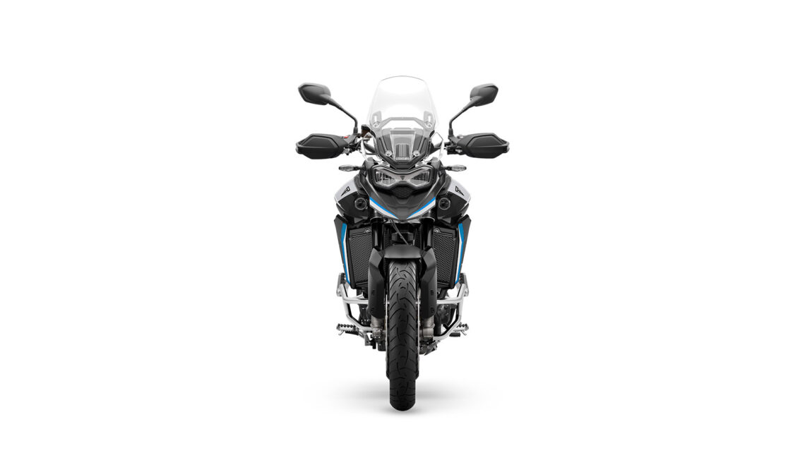 - Soportes del guardabarros delantero, el pico, los embellecedores delanteros del depósito y las tapas del radiador en Sapphire Black a contraste con el depósito y el panel bajo el asiento en Snowdonia White. Luce detalles en Aegean Blue alrededor del radiador. Las asas para el pasajero están en Matt Phantom Black.