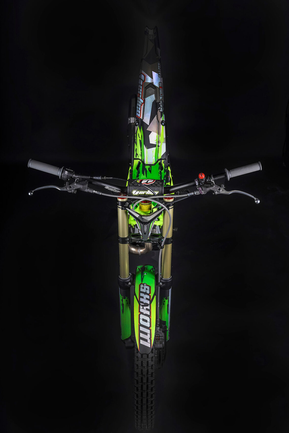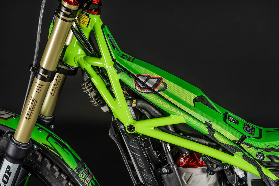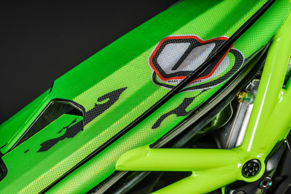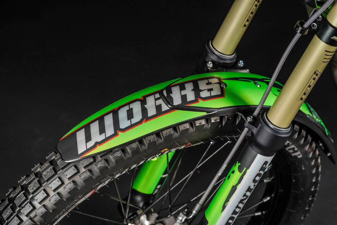Por supuesto, la Vertigo Nitro Works 2025 luce una nueva decoración espectacular y llamativa, con el color verde corporativo como protagonista acompañado de su ya famosa 'piel de serpiente' que protege zonas como horquilla, el basculante o el subchasis, entre otros.
