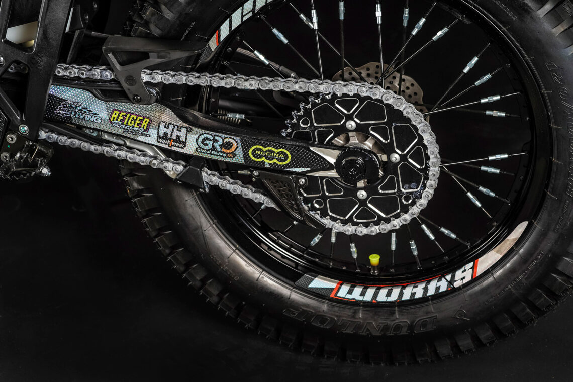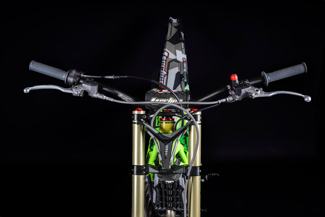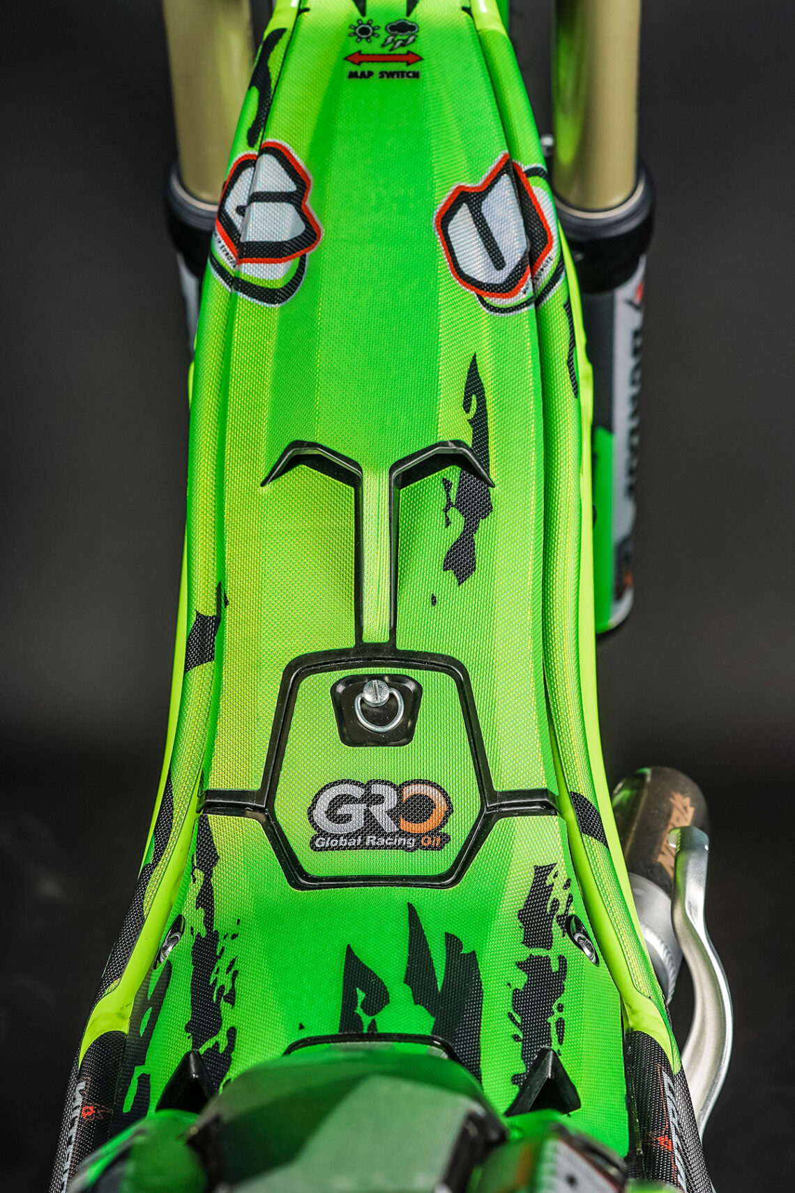 Por supuesto, la Vertigo Nitro Works 2025 luce una nueva decoración espectacular y llamativa, con el color verde corporativo como protagonista acompañado de su ya famosa 'piel de serpiente' que protege zonas como horquilla, el basculante o el subchasis, entre otros.