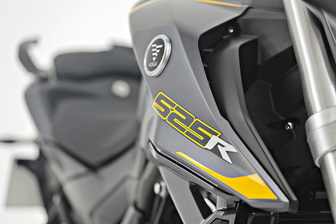 Poco a poco, en 2023 Voge ha ido actualizando sus modelos de "medio litro" con este nuevo motor, como pudimos ver con la Voge 525ACX y la Voge 525DSX. Y ahora, con la Voge 525R, le ha tocado el turno a la naked de referencia de la marca. La principal característica de esta 525R reside en la motorización 525: un grupo motor bicilíndrico en línea con refrigeración líquida basado en el que impulsa a los modelos 500, y en el que interiormente se ha cambiado todo. Las medidas internas no tienen nada que ver y ahora se adapta una configuración cuadrada, de manera que tanto el diámetro como la carrera son de 68 mm, y eso ha permitido aumentar la cilindrada de 471 a los 494 cc. La potencia sigue siendo de 35 kW (47,6CV), manteniéndose así en el límite legal permitido para los usuarios con el carnet A2, mientras que el par motor máximo alcanza los 44,5 Nm, aportando un comportamiento mucho más elástico y aprovechable. La relación de compresión pasa de 10,7 a 11,5:1, mientras que la distribución mantiene el doble árbol de levas en culata (DOHC) con cuatro válvulas por cilindro. Se estrena un nuevo mapa de inyección, que corre por cuenta de Bosch. Las emisiones de CO2 son de 89 g/km y la metamorfosis mecánica se completa con un nuevo cambio de 6 velocidades