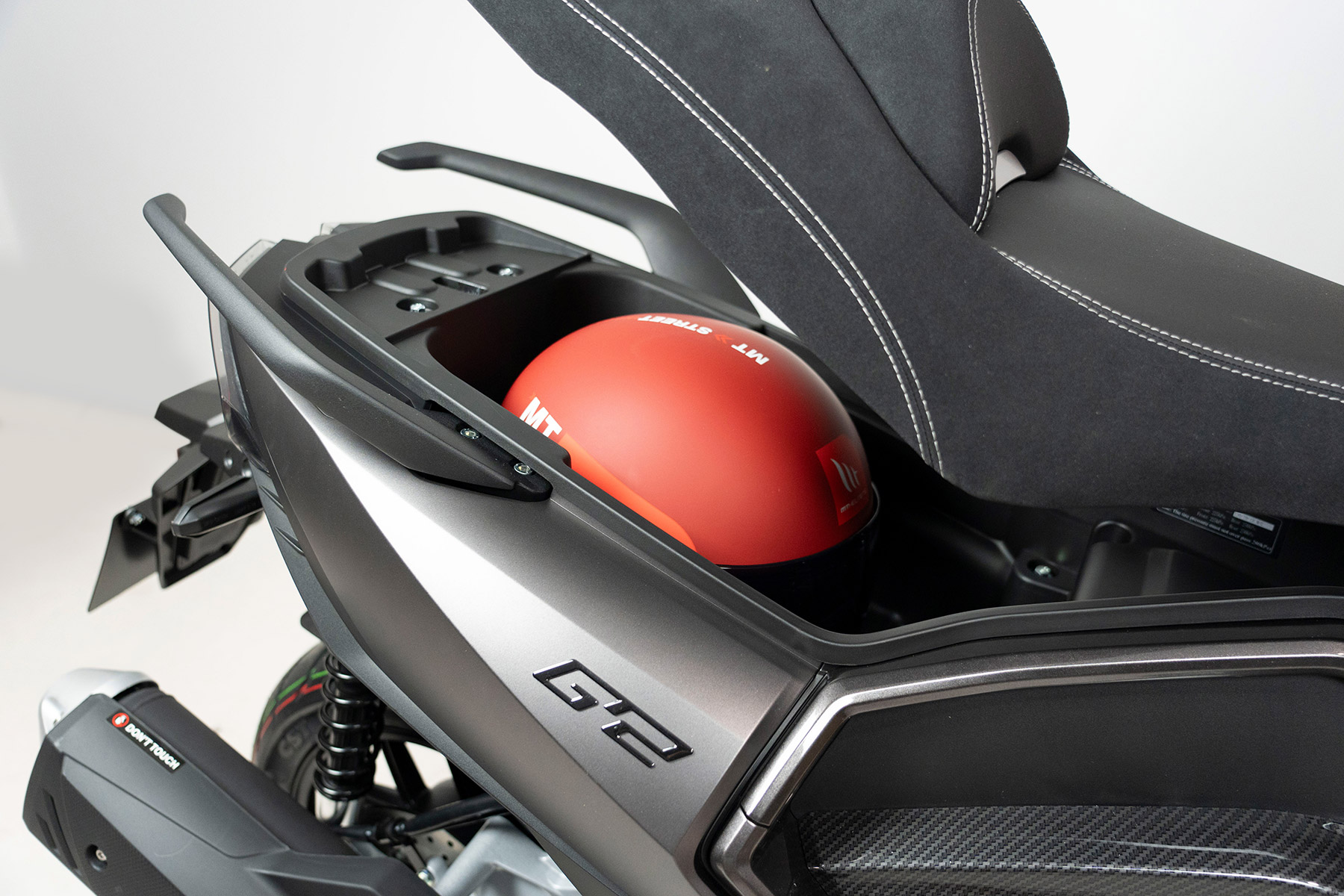 Para ser un buen scooter gzan turismo, tiene que ofrecer una buena capacidad de carga. Primero, encontramos dos guanteras delanteras con cubierta a lo que hay que añadir sobre todo el hueco bajo el asiento en el que se puede guardar el casco.