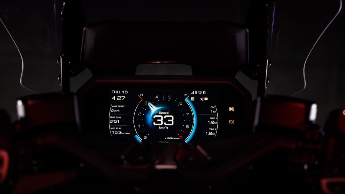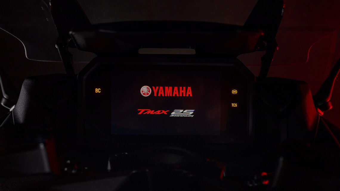 En el apartado tecnológico, el TMAX 25 Aniversario incorpora una pantalla TFT de 7" conectada con la app MyRide, que permite acceder a información del vehículo, trayectos y notificaciones. Además, incluye navegación Garmin con mapas completos, control por voz y funciones de tráfico y meteorología.