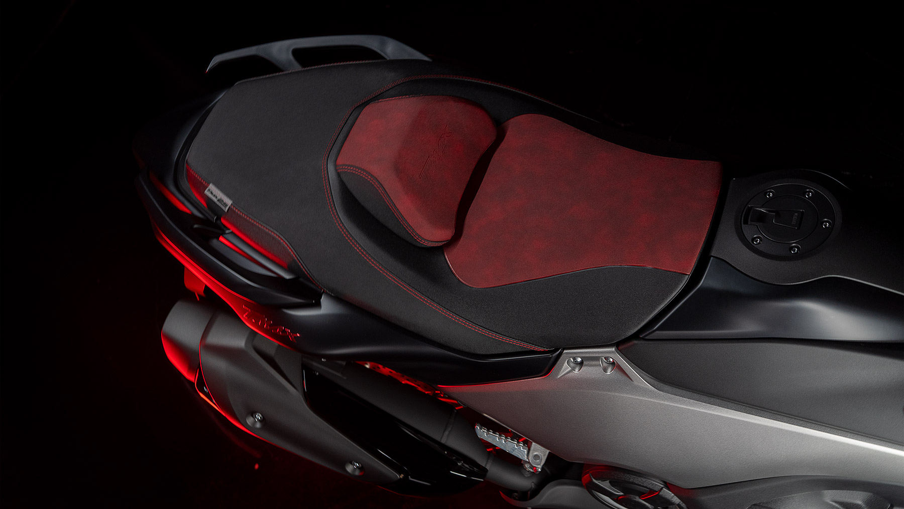 La TMAX 25 Aniversario destaca por una combinación de colores y detalles únicos que refuerzan su carácter premium. La carrocería principal luce un elegante tono Dark Gray Metallic mate, mientras que los icónicos “boomerangs” laterales se presentan en Light Gray Metallic, en clara referencia a la Black MAX original. El conjunto se completa con un asiento rojo oscuro con doble costura, un logotipo estampado en caliente y los distintivos emblemas TMAX 3D en rojo cromado sobre los paneles traseros.