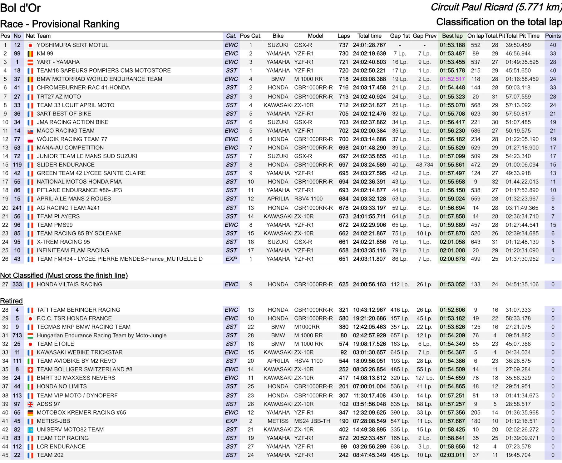 Sin graves errores, los de Suzuki fueron sólidos en el trazado francés: 737 vueltas en 24h01'28''. De hecho, Black y Masson ya saben lo que es ganar allí cuatro veces, y Suzuki ya llega a la veintena en Paul Ricard. Por su parte, el YART Yamaha no pudo defender el título con éxito tras dos paradas inesperadas en su box que le hicieron perder sus opciones. También cometió errores el BMW Motorrad, con un accidente del piloto recién llegado, Hannes Soomer, que le dejó la victoria en bandeja al equipo japonés.