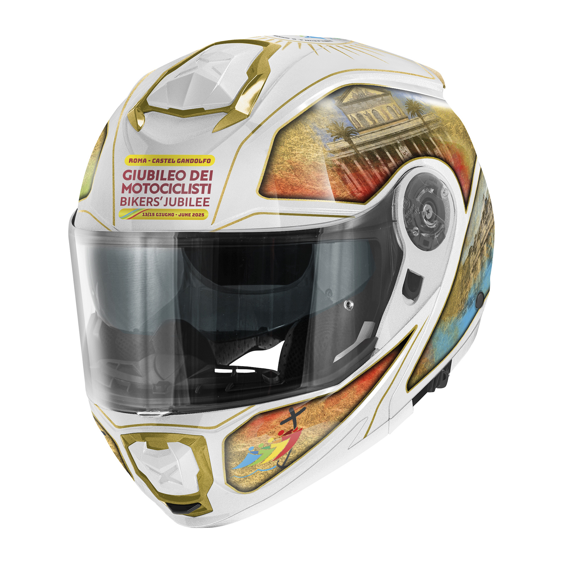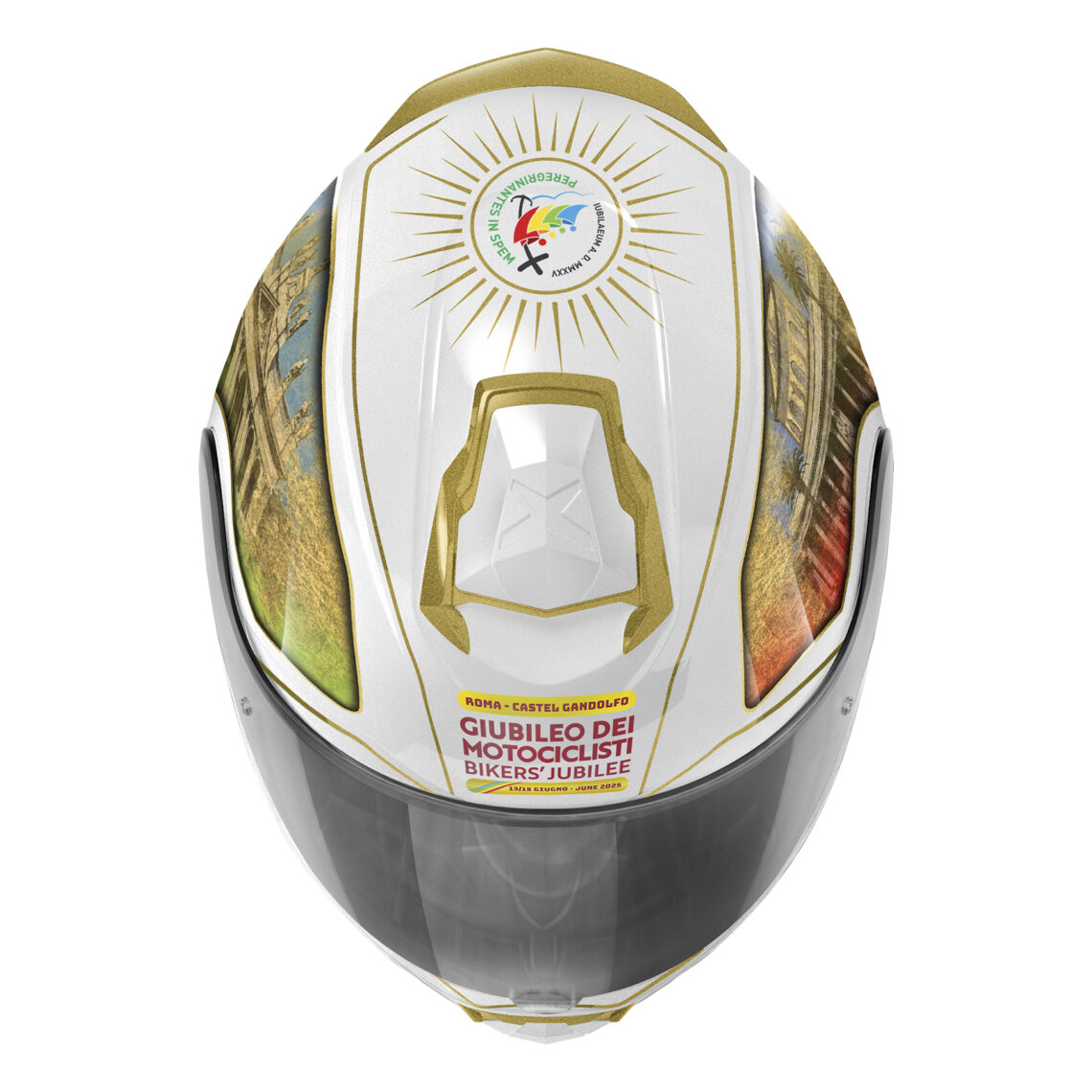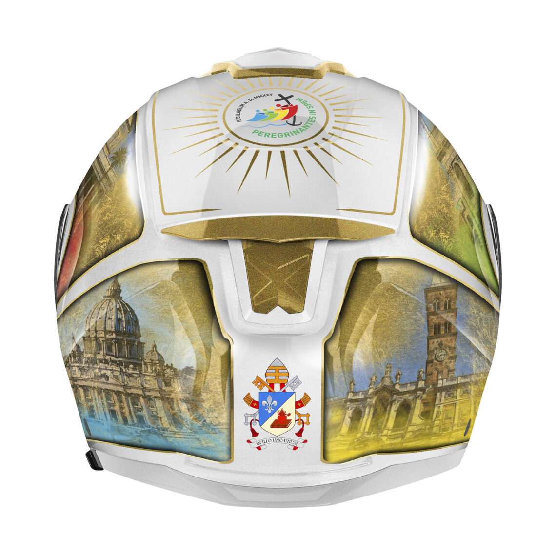 Bajo la mano de la artista Norma Lucia Angius (ATRE), el casco luce una decoración inspirada en los colores del Jubileo y en la que aparecen las cuatro basílicas pontificias romanas, envueltas en una atmósfera luminosa que evoca el espíritu de fe y de camino compartido.