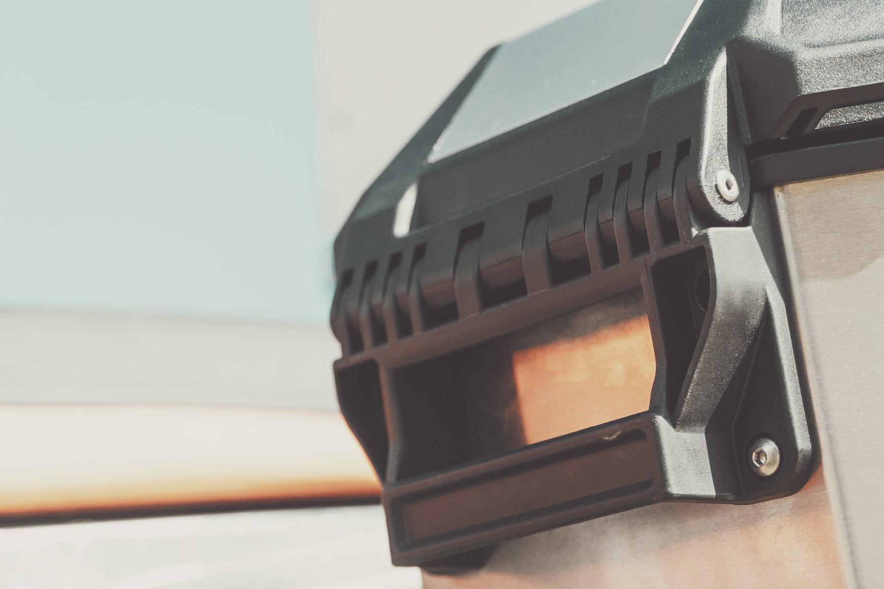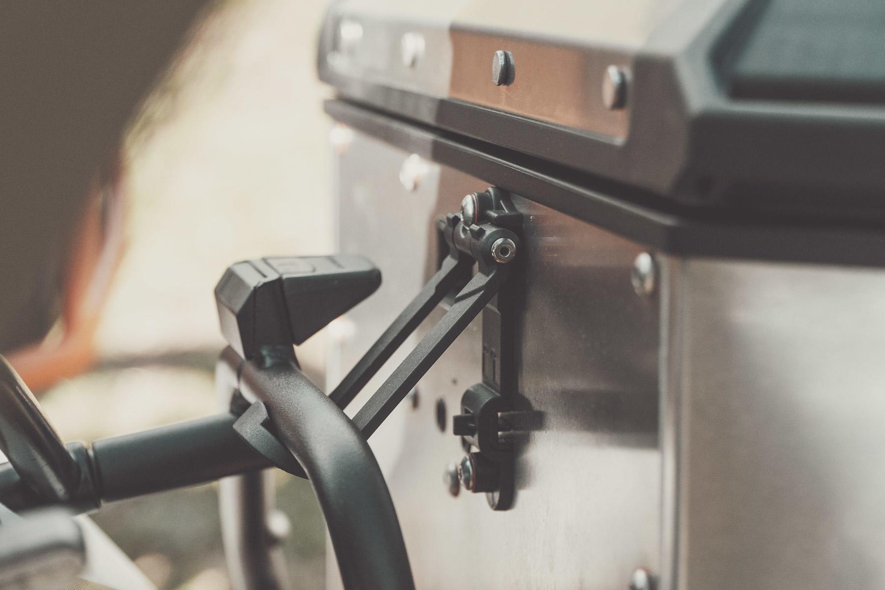 Otra de las soluciones más llamativas es la incorporación de un gancho mecánico en la parte trasera, que permite desanclar la maleta y funcione como tope, quedando la maleta inclinada ligeramente sin llegar a soltarse, lo que permite que no se caiga por error al desanclarla, o bien poder abrirla sin desmontarla completamente cuando la moto cuente con un top case de grandes dimensiones. Para finalizar, se ha mejorado la resistencia y absorción de vibraciones de los bastidores laterales, así como la impermeabilidad para proteger el contenido frente al agua y polvo, gracias a la incorporación de juntas estancas industriales y la utilización de respiraderos para evitar variaciones de presión.