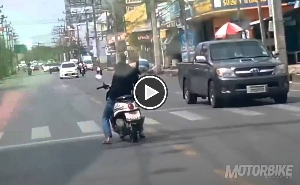 Estas imágenes fueron grabadas hace unos días en las calles de una ciudad de Tailandia. El conductor de este scooter parece que se está quedando dormido y, mientras ladea su cabeza, conduce con altísimo riesgo de caer o chocar contra otros vehículos. ¿Cómo es posible quedarte tan dormido como para no darte cuenta de que estás conduciendo una moto?