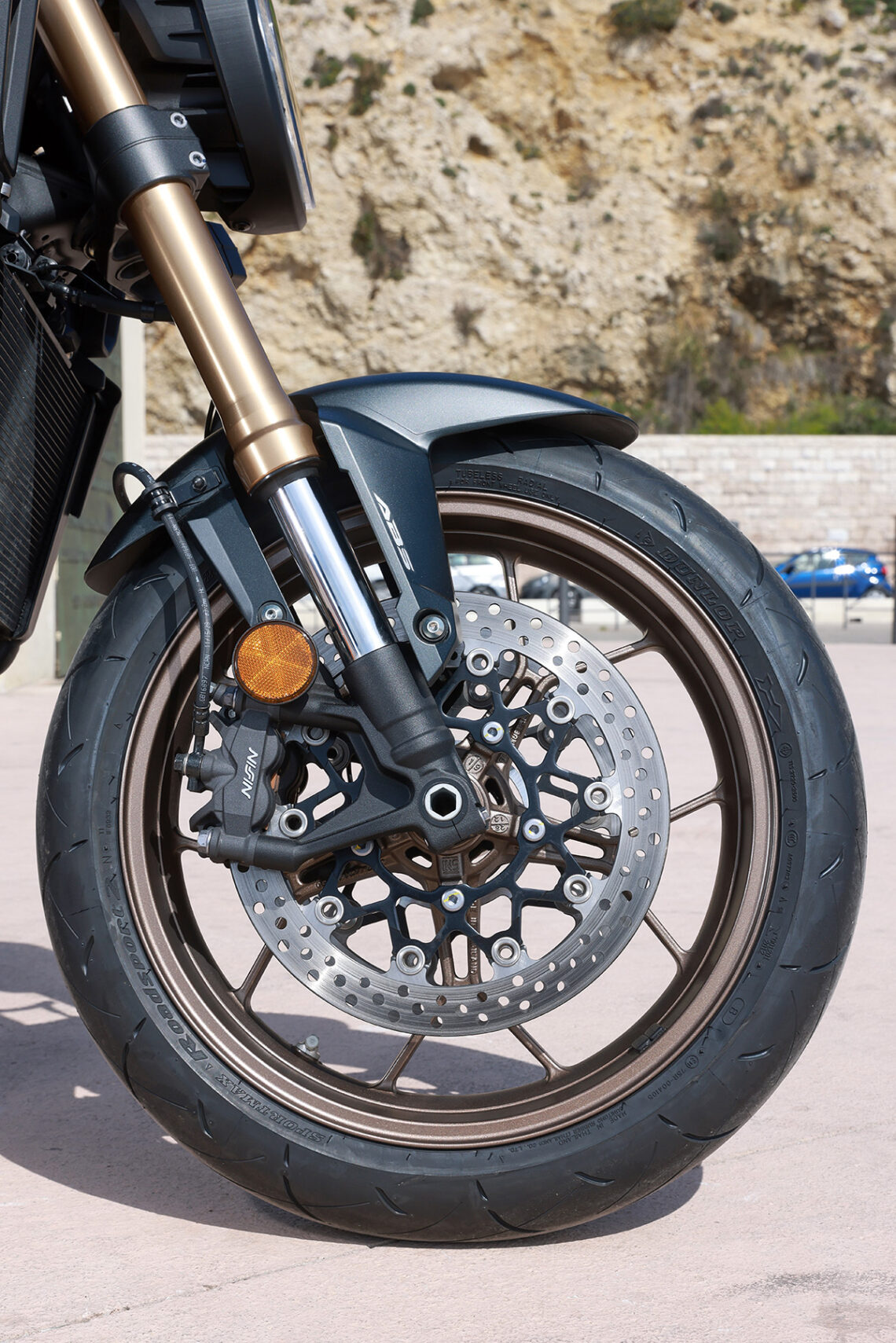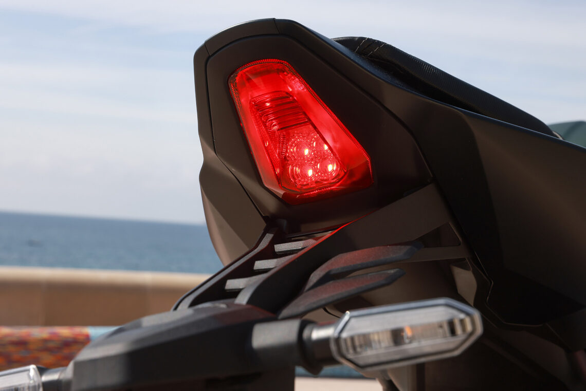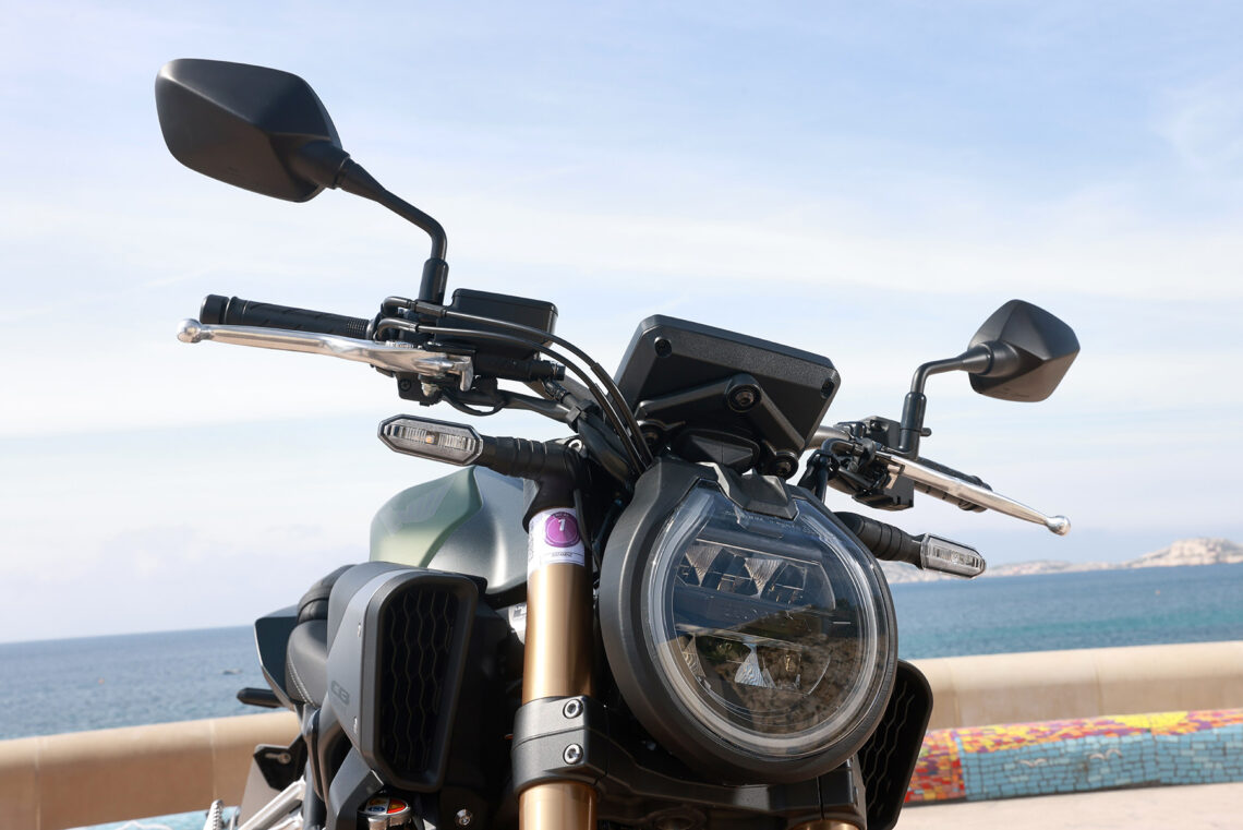 Mientras, los frenos de la CB650R 2024 siguen intactos respecto la versión anterior, sin fallos, buena mordiente, buen tacto, todo en su sitio. Poco más que decir para un uso por carretera tanto diario como deportivo. Solo en circuito a ritmo alto podríamos ver si flaquean, pero no es su pretensión, y aun así, por lo poco que puedo saber de frenos, no tiene pinta de ser un conjunto problemático más allá de ese set de latiguillos de goma.