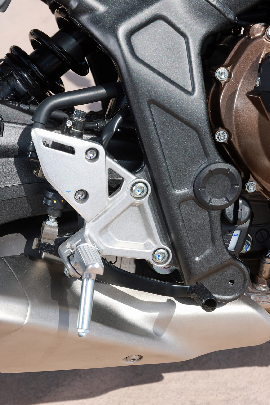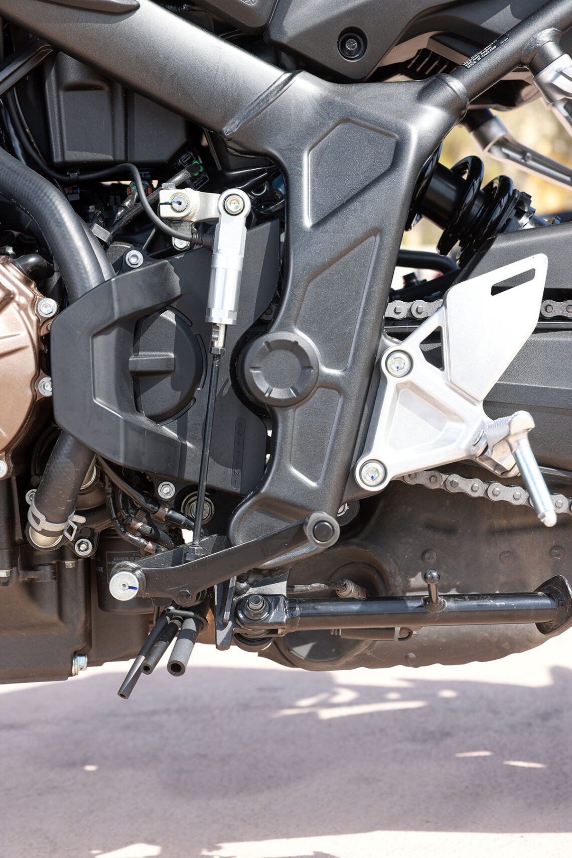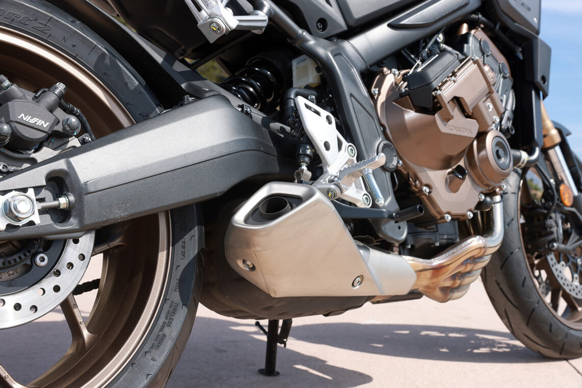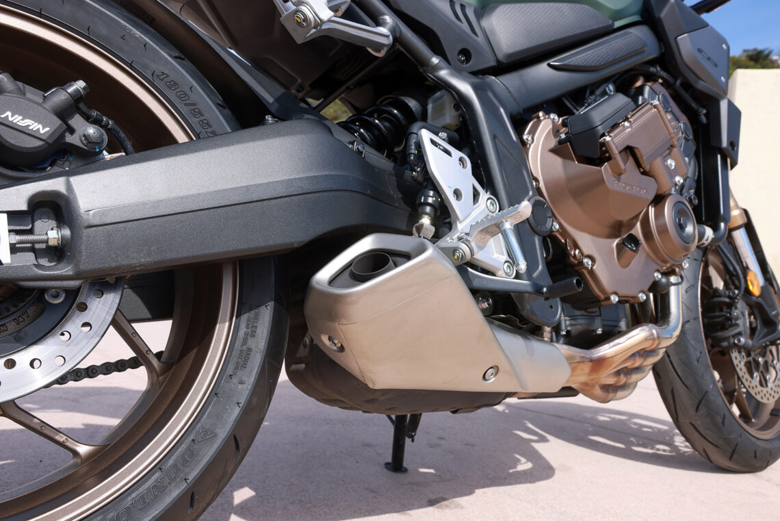 En el apartado geométrico la Honda CB650R se muestra cortita, ágil, muy compacta y sólida, aunque a veces, si el asfalto es regulero y abrimos gas de manera excesiva con buena tracción responde con algo de nerviosismo el amortiguador trasero, al fin y al cabo va anclado directamente al basculante sin bieletas.