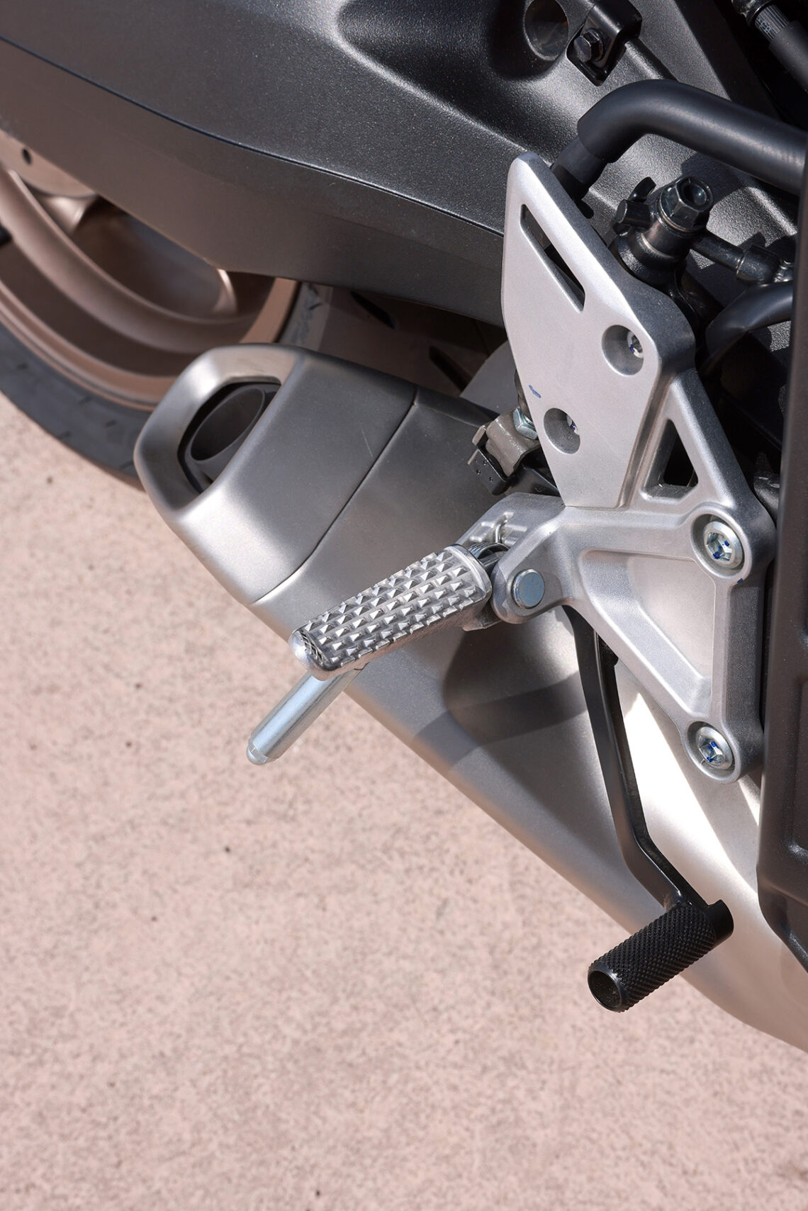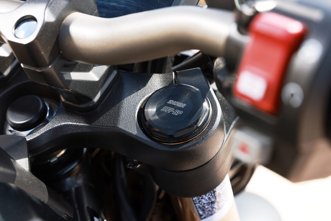 La parte ciclo cuenta con una suspensión delantera invertida Showa SFF-BP de funciones separadas, sin regulación, y un monoamortiguador trasero sin bieletas regulable en 10 puntos de precarga. Los frenos cuentan con doble disco delantero de 310 mm mordidos por doble pinza de 4 pistones Nissin de anclaje radial.