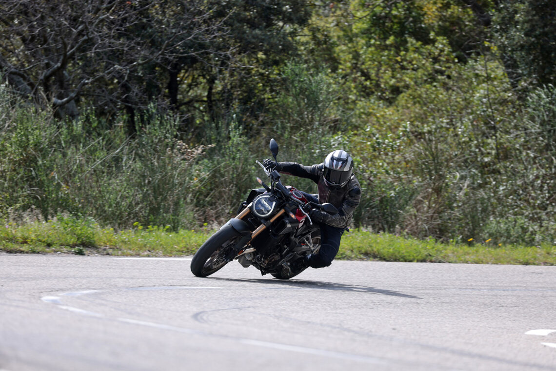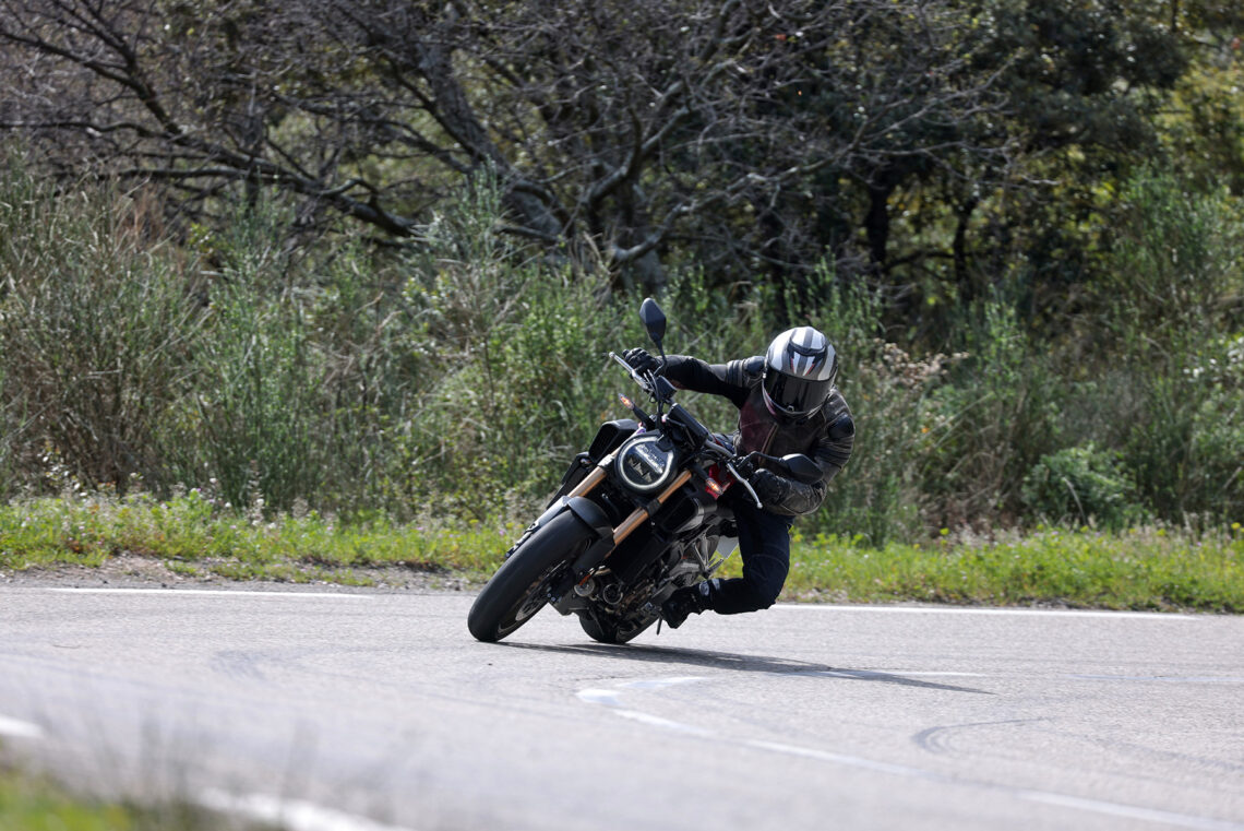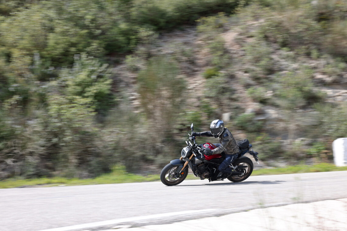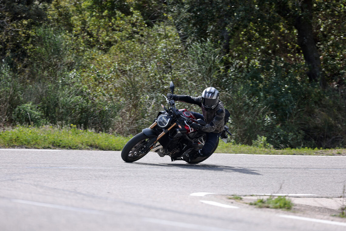 En términos generales la Honda CB650R sigue siendo muy vertiginosa a la hora de acometer curvas, muy noble y estable en el paso por curva, y algo más nerviosilla saliendo de ella si vamos muy animados.