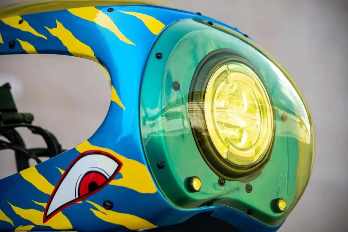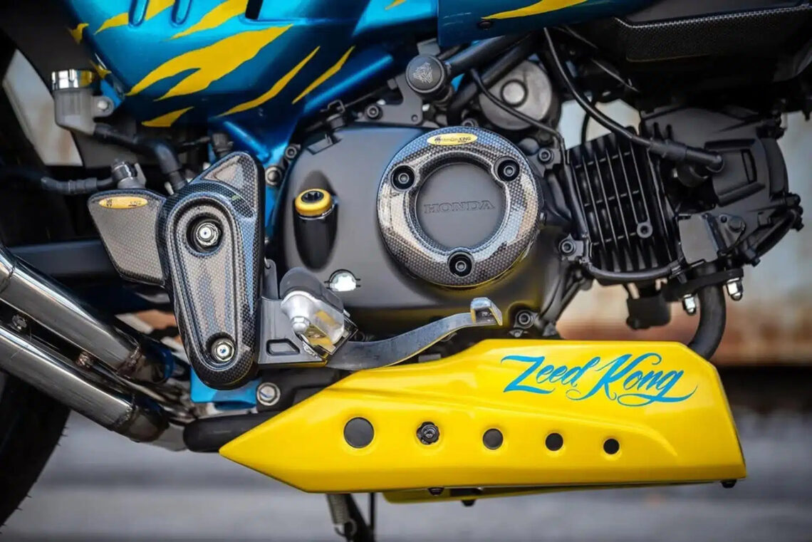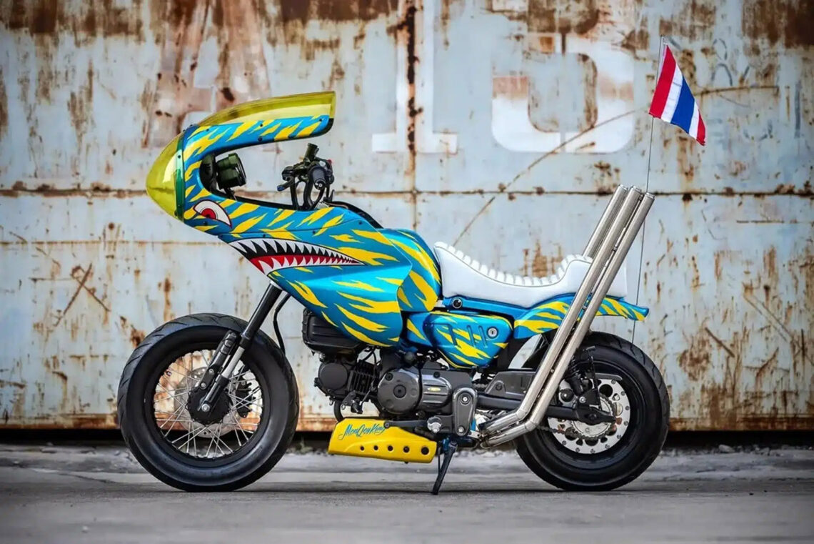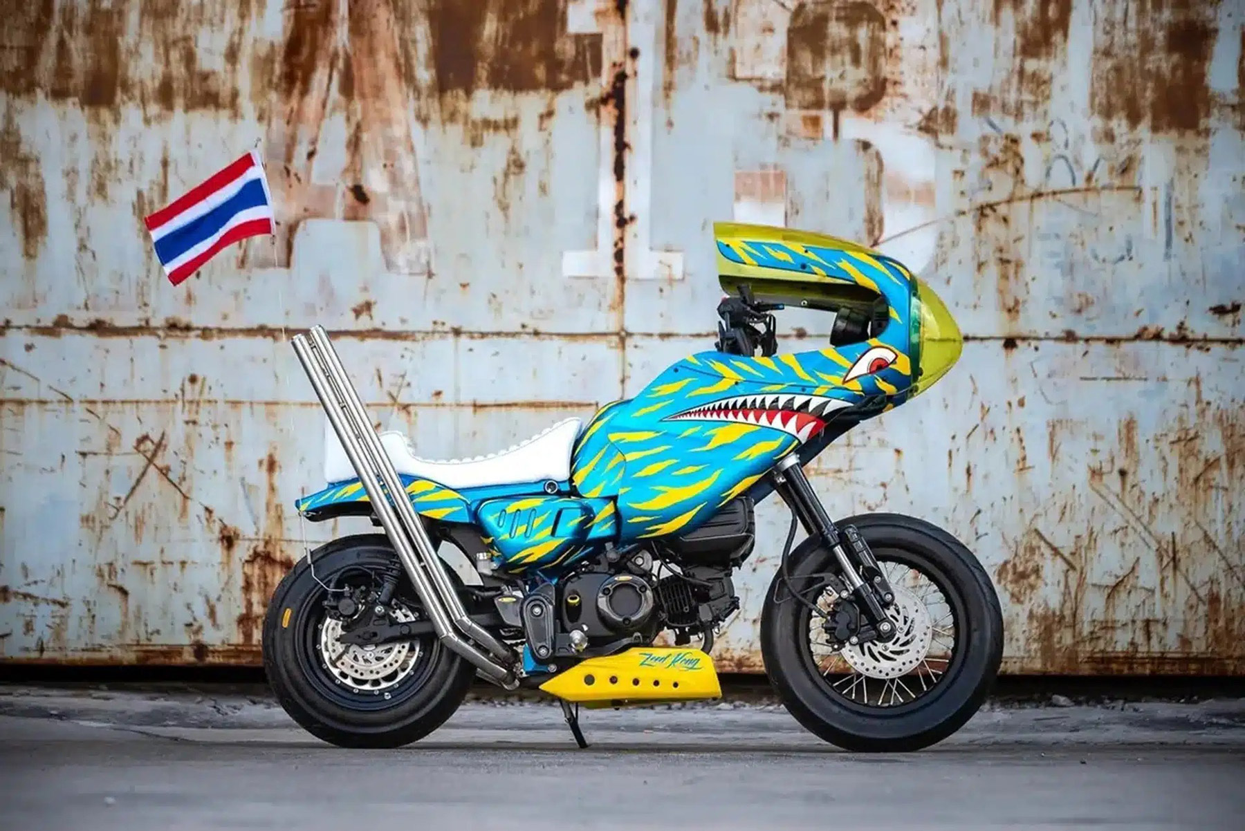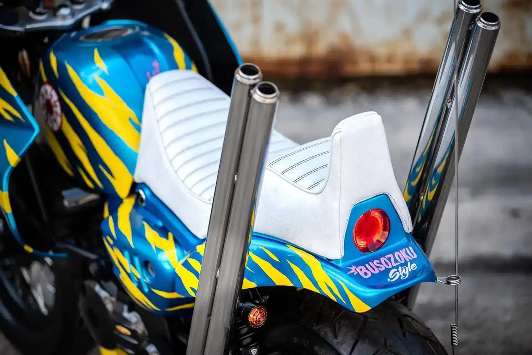 Construida por el taller Advanced Automotive Accessories, con sede en Tailandia, esta Honda Monkey 125 es una interpretación moderna del estilo Bosozoku. Destacan sus tubos de escape dobles en cada lado, un asiento blanco que contrasta de manera drástica con el resto de la moto, dientes de tiburón pintados en su enorme carenado, una pantalla parabrisas amarilla de forma peculiar y una cubierta del faro en color verde. Todos estos elementos se combinan para crear un diseño tan peculiar como fiel a la esencia de esta subcultura japonesa.