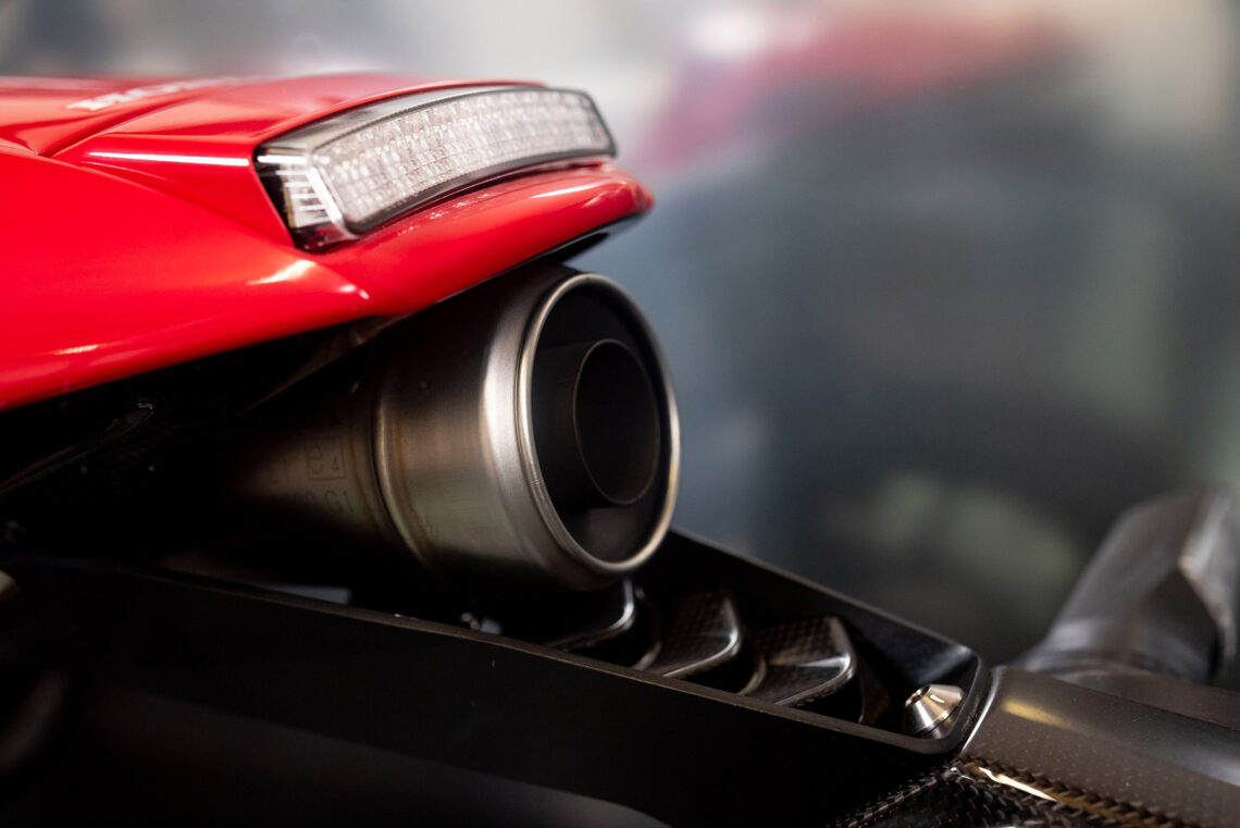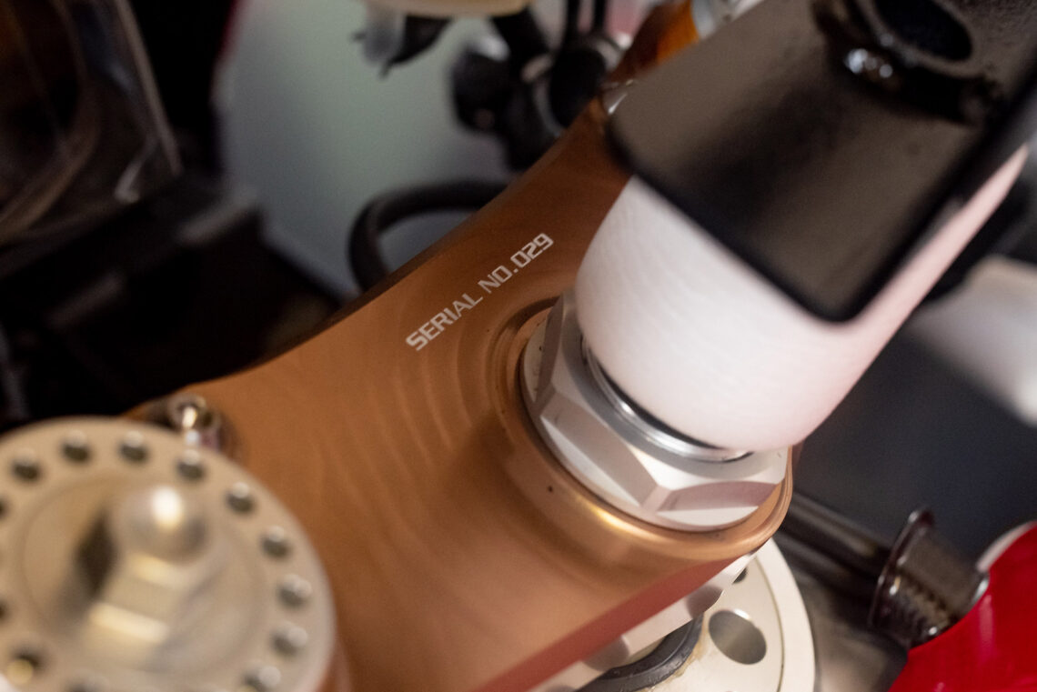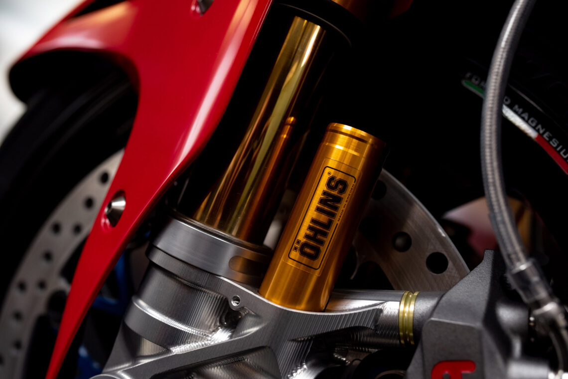 Evidentemente todo en ella es pata negra, como la horquilla delantera Öhlins TTX, los frenos firmados por Brembo o las llantas Marchesini Racing de magnesio forjado.