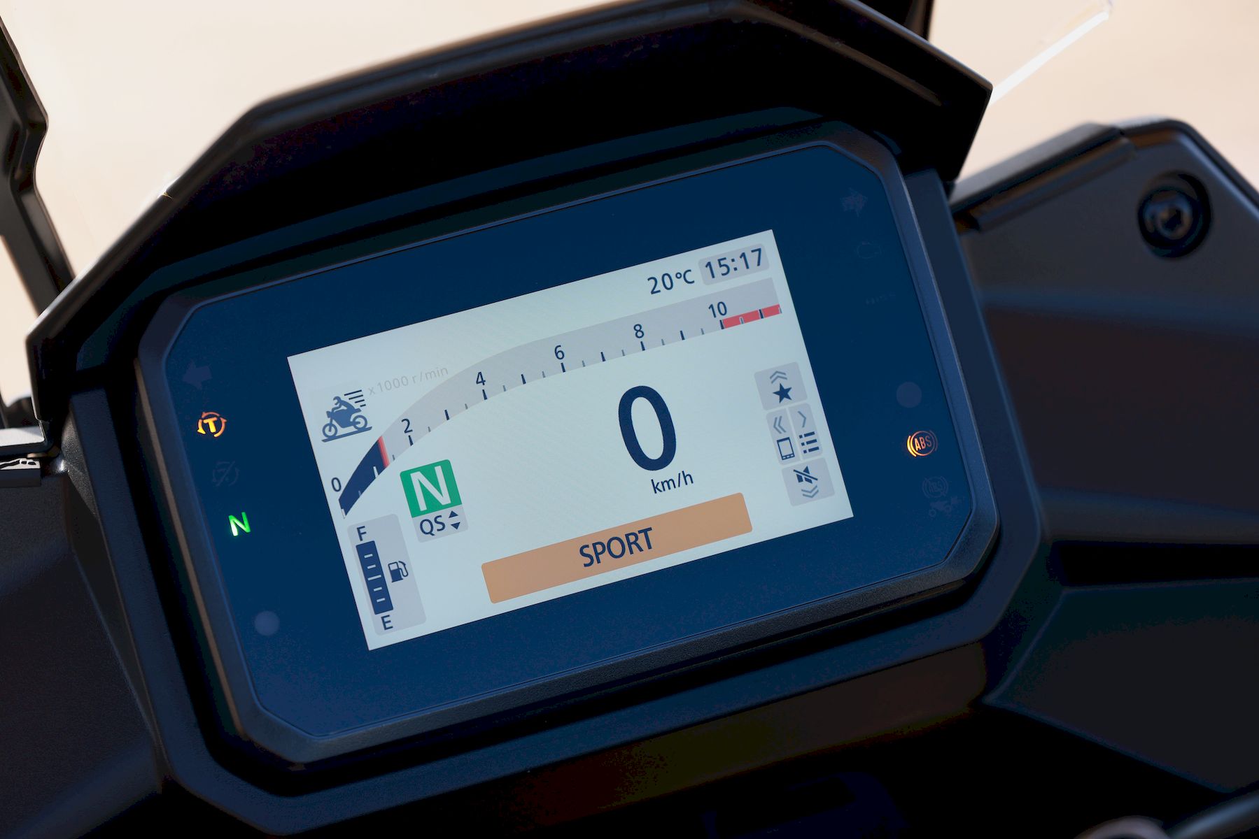 La dotación electrónica de la Honda Transalp 2025 incluye acelerador RbW, seis modos de conducción (Rain, Standard, Sport, Gravel y User1 y User2 -personalizables- con cuatro entregas de potencia diferentes), freno motor (3 niveles), control de tracción/anti-caballito (5 niveles, desc.) y ABS (2 niveles, desc. en la rueda trasera). Instrumentación TFT de 5" (4 diseños de info. y sensibilidad lumínica) con conectividad por voz HSVC, iluminación full-LED, intermitentes autocancelables, warning de emergencia en frenada, maneta de freno regulable o toma de corriente USB tipo C (bajo el asiento del pasajero).