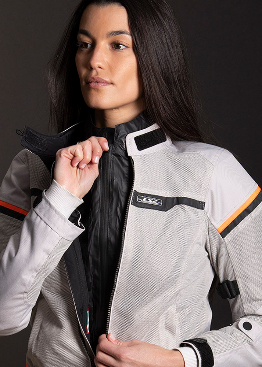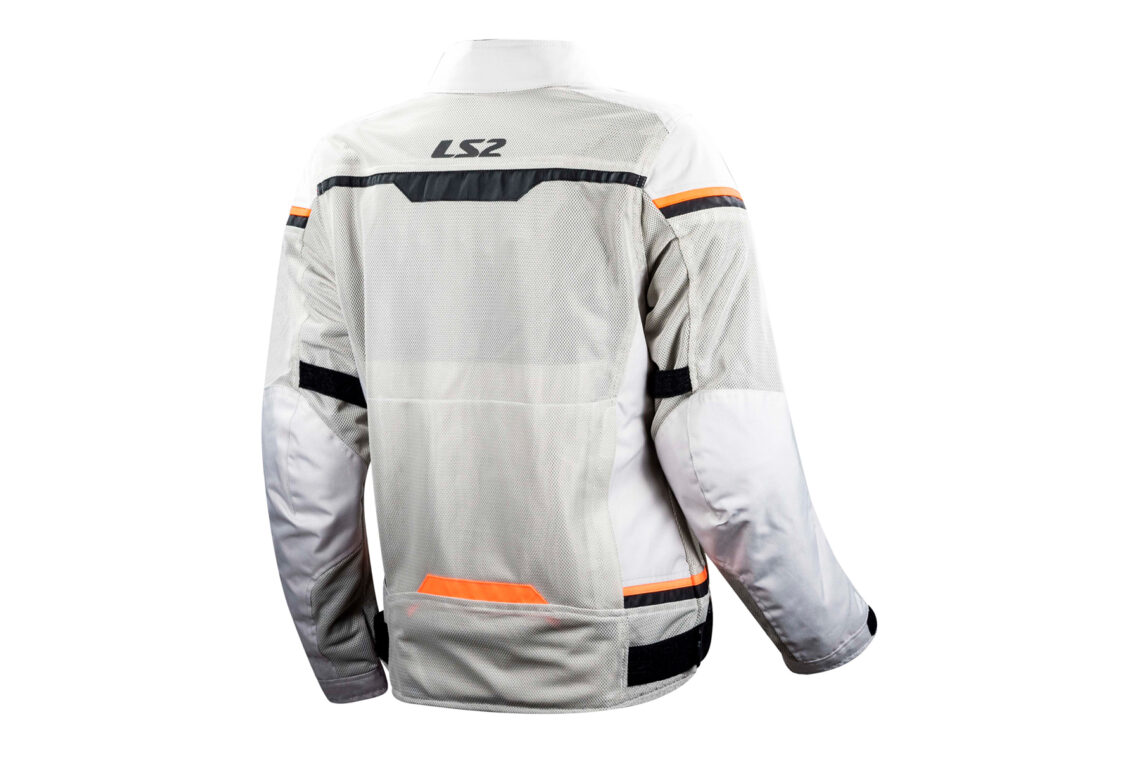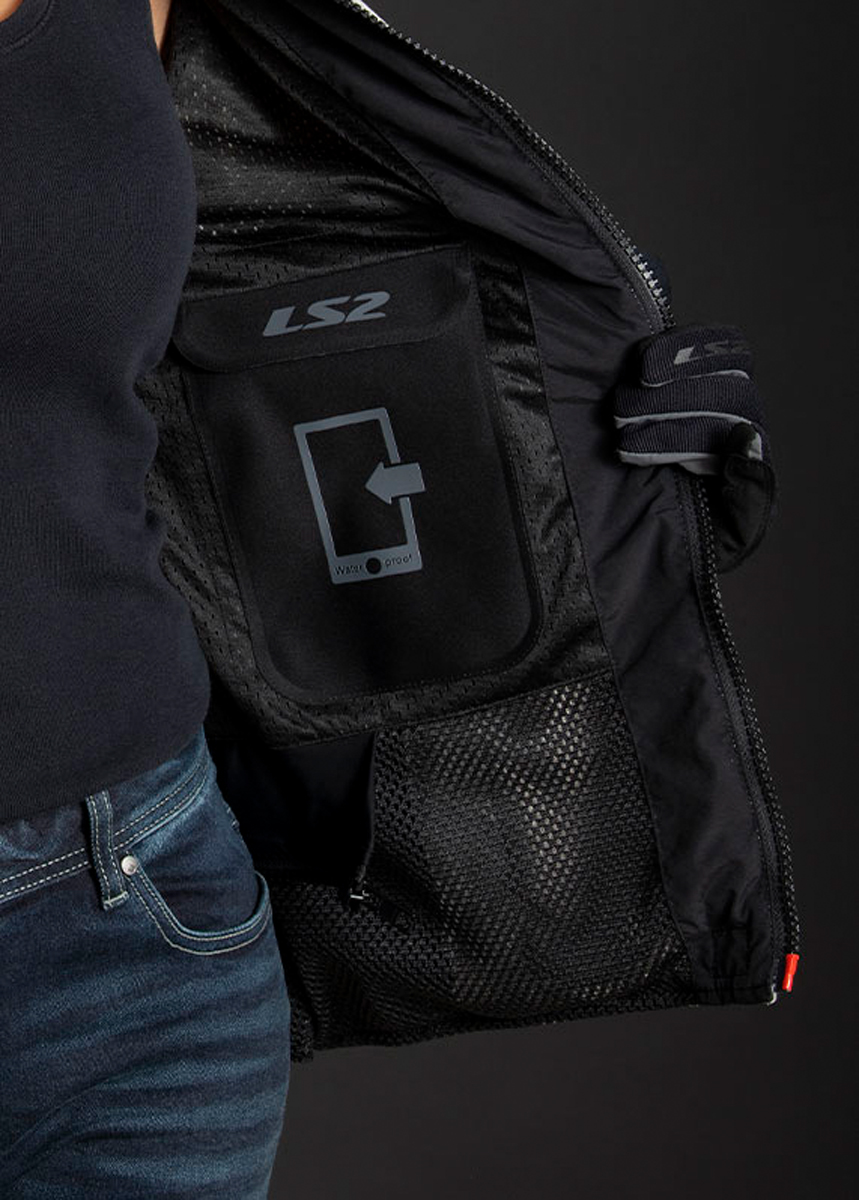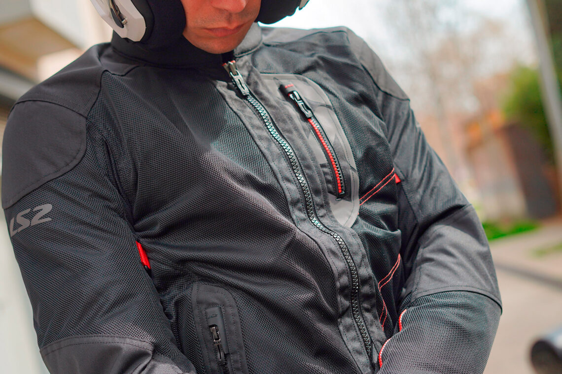 Es cierto que en verano suele llover muy pocos días, pero siempre cabe la posibilidad de ir en moto y que te caiga un chaparrón imprevisto. Para ello, LS2 ha pensado en la chaqueta Riva, que además de ser ligera y transpirable también es impermeable. Esta prenda tiene tres capas de poliéster 600 D 92T, con un forro interior que no deja pasar el agua, pero desmontable en caso de no necesitarla o para ponérselo por fuera. Al igual que sus hermanas para verano, dispone de ajustes en puños, brazos y cintura, pero esta prenda destaca por presentar protecciones en hombros y codos desmontables (EN1621-1: 2012 Nivel CE 1), siendo éstas últimas ajustables en dos posiciones. También puede completarse la protección con una espaldera LS2 851 Level 2 back opcional. Además de las bandas reflectantes y sus ajustes de velcro, también tiene una cremallera para juntarse con unos pantalones.