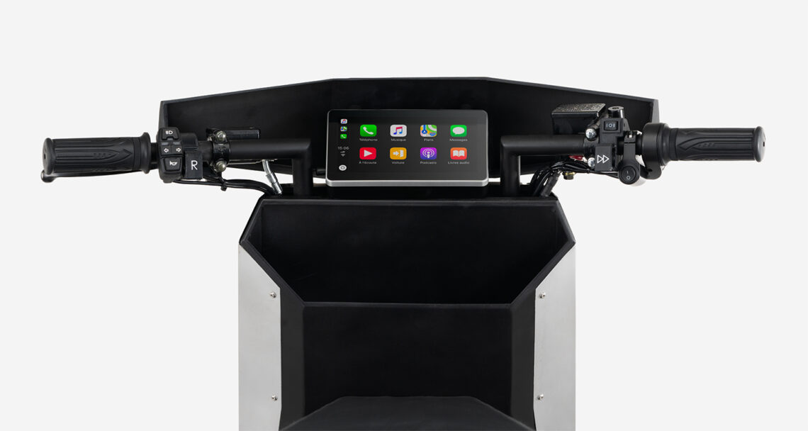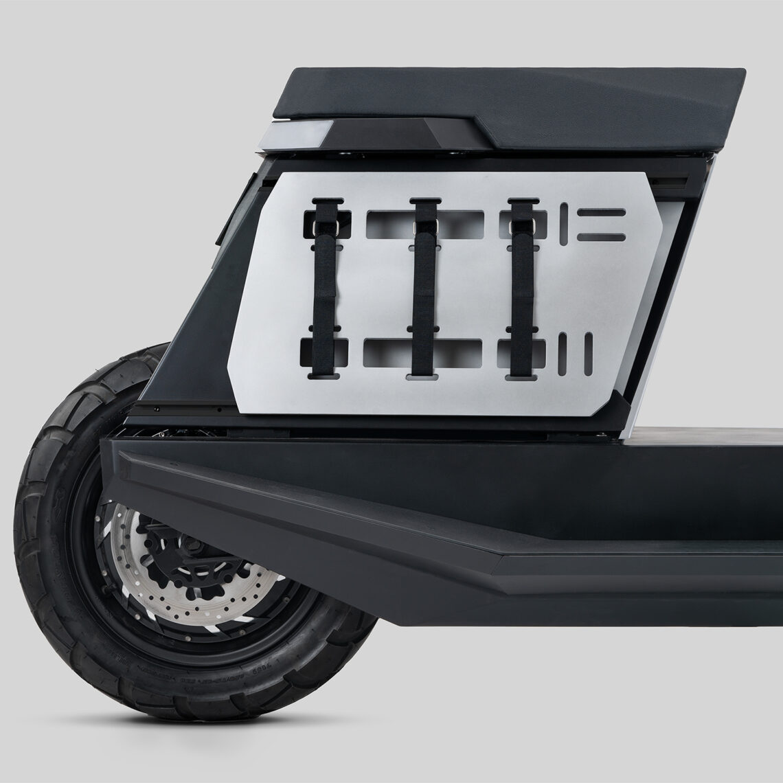 Llama la atención la parte trasera, donde se pueden desmontar las tapas laterales y acoplar sistemas modulares para añadir compartimentos de equipaje externos, con alforjas o incluso altavoces o baterías adicionales conectables para aumentar su autonomía. También hay espacios por todo el scooter eléctrico, como en el contraescudo, bajo el asiento o al lado de los muslos.
