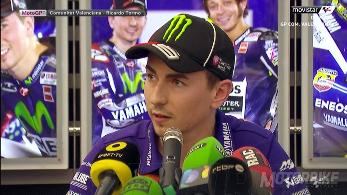 Ya ha comenzado la acción en el Circuito Ricardo Tormo de Cheste en uno de los jueves más movidos que se recuerdan. Tras la cancelación de la rueda de prensa oficial, los pilotos citados para ella han comparecido de uno en uno. El primero en hablar ha sido Jorge Lorenzo en una rueda de prensa en el hospitality de Yamaha que ha generado una gran expectación y en la que ha pedido disculpas por mostrar el pulgar hacia abajo cuando Rossi recogía su trofeo en Sepang. Estas han sido sus declaraciones más destacadas: